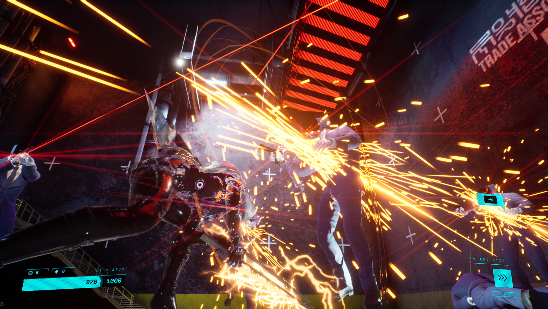 회피, 배면 공격, 시간 멈추기, 칼 던지기, 발차기 등 다양한 기술을 조합하여 적과 싸울 수 있습니다. 적을 해킹하여 다른 적 근처에서 자폭시키거나, 장애물 근처에서 자폭시켜 길을 열 수도 있습니다.