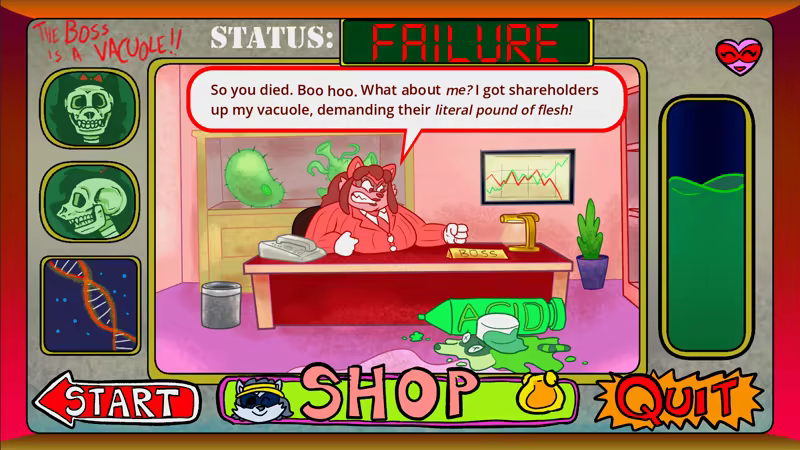 Rebbecca Valentine is a raccoon with quite the appetite. This game takes place in the corrupt, poorly run company that is her stomach. You play as a lowly worker cell, and perform the dangerous duty of breaking up the food Rebbecca eats with your acid blaster. Keep up with Rebbecca's eating habits, as this is supposed to be an iron stomach, and your Boss expects results--and she's not gonna be happy if you fail and make Rebbecca sick!