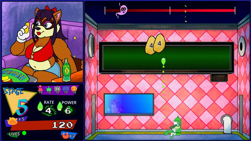 GutBuster is a classic arcade-style shooter, with hand-drawn animations and satirical comedy about corporate greed, the digestive system, and erotic gluttony. Controls are simple: just run, while the gun shoots upwards automatically! Run and use your dodge-roll ability to avoid the food targets as you blast, so you don't get crushed! This is a challenging, yet casual game where you can continue as many times as you want. Accessibility options are available if you want to make it easier, or just want to see the story.