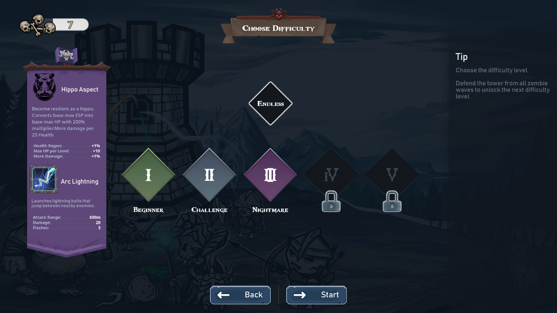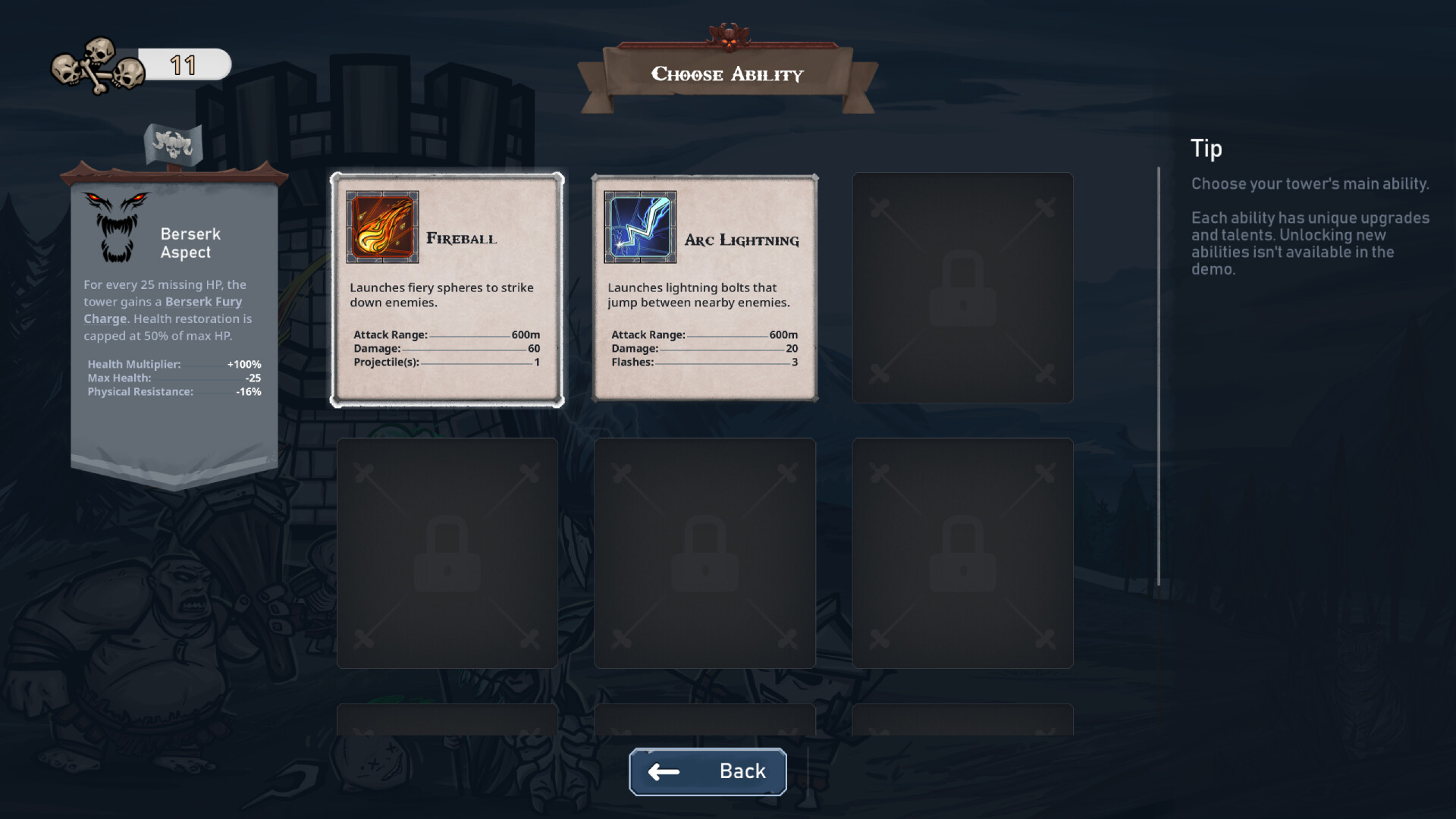 The demo lets you experience three levels of difficulty, Endless Mode, a couple of main abilities, and 7 tower aspects. Enhance your tower by getting the upgrades from the shop, treasure chests, and by completing achievements. Experiment with different talents and effects to find the perfect combination for survival.