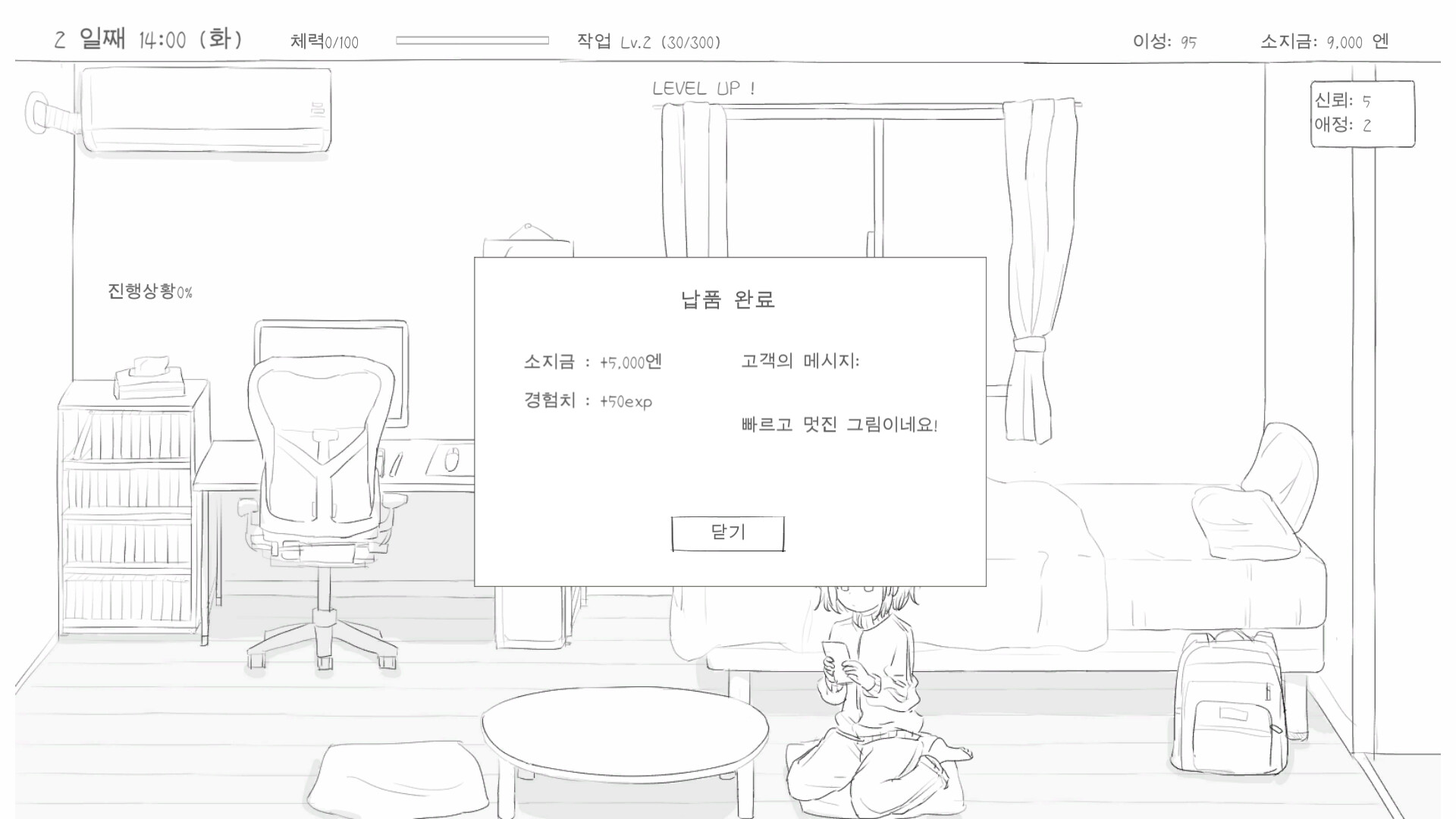 프리랜서 작업과 여동생과의 시간을 적절히 나누어 하루를 보내세요. 여동생과 대화를 나누고, 공부를 가르치며, 따뜻한 칭찬도 해줄 수 있습니다. 하지만 잊지 마세요. 삶의 질을 높여줄 다양한 물건을 구매하려면 외주 작업도 성실히 수행해야 합니다.