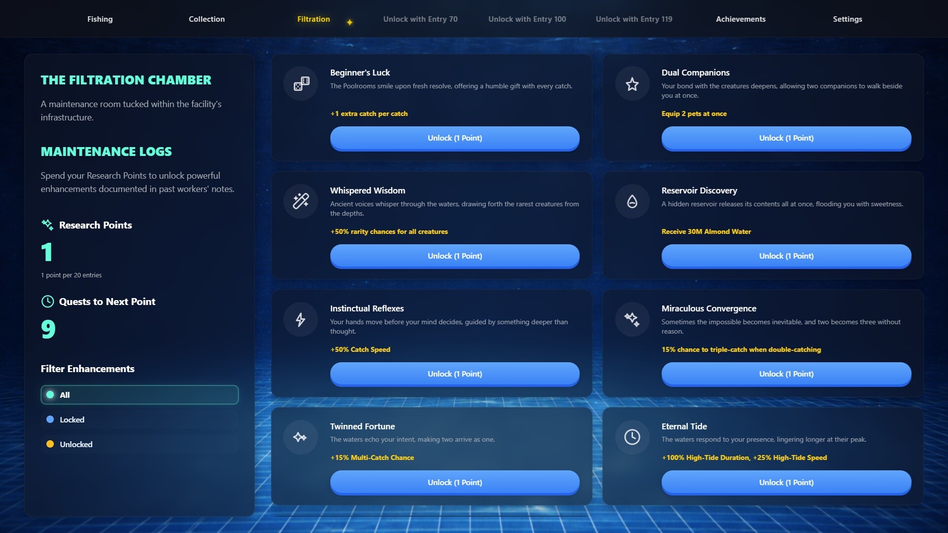 One moment you were walking home, the next - a wrong step, a sudden fall, and you found yourself in an endless expanse of pools stretching into infinity. Welcome to Level 7 of the Backrooms, known as "The Poolrooms". With nothing but a fishing rod and your wits, you must fish to survive in this liminal space where reality itself seems to ripple like water.