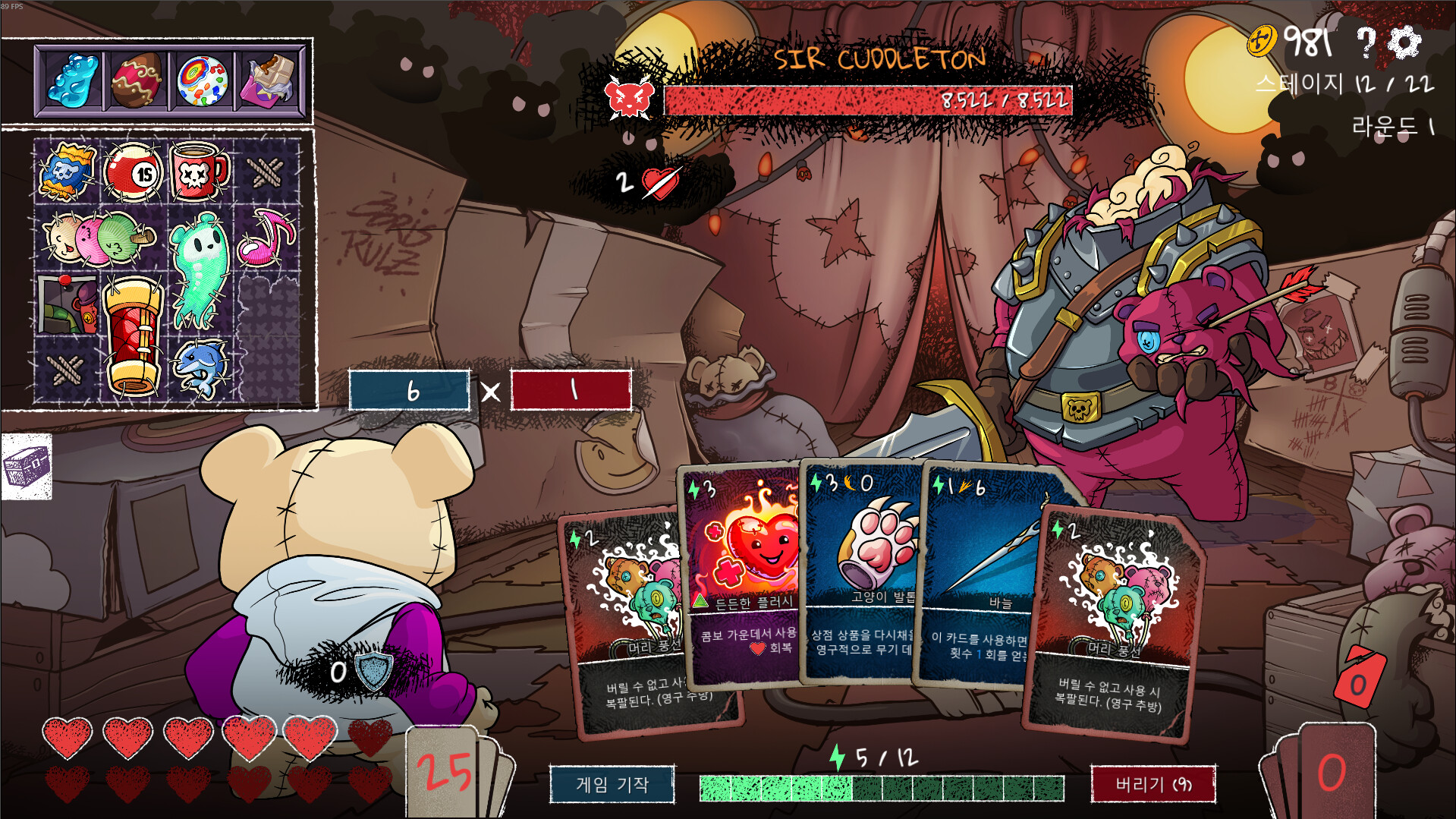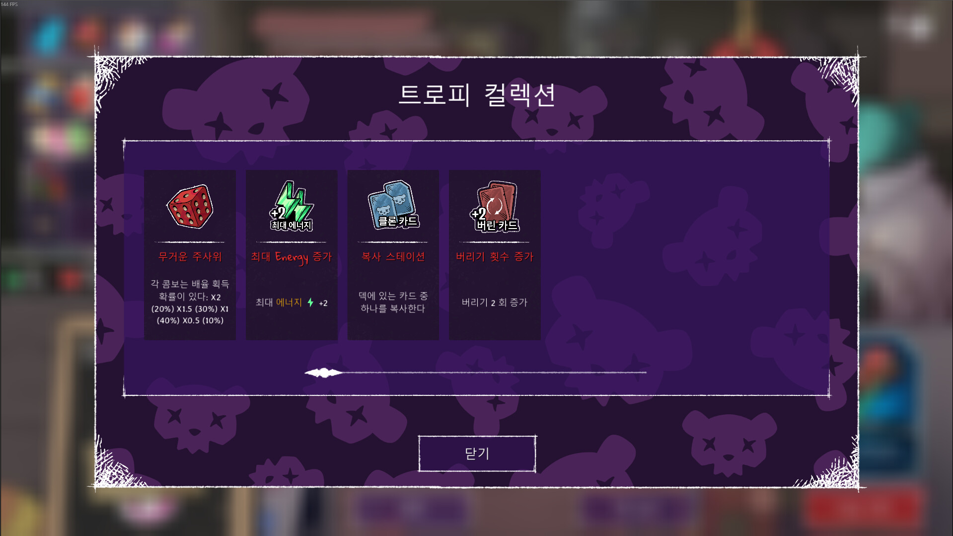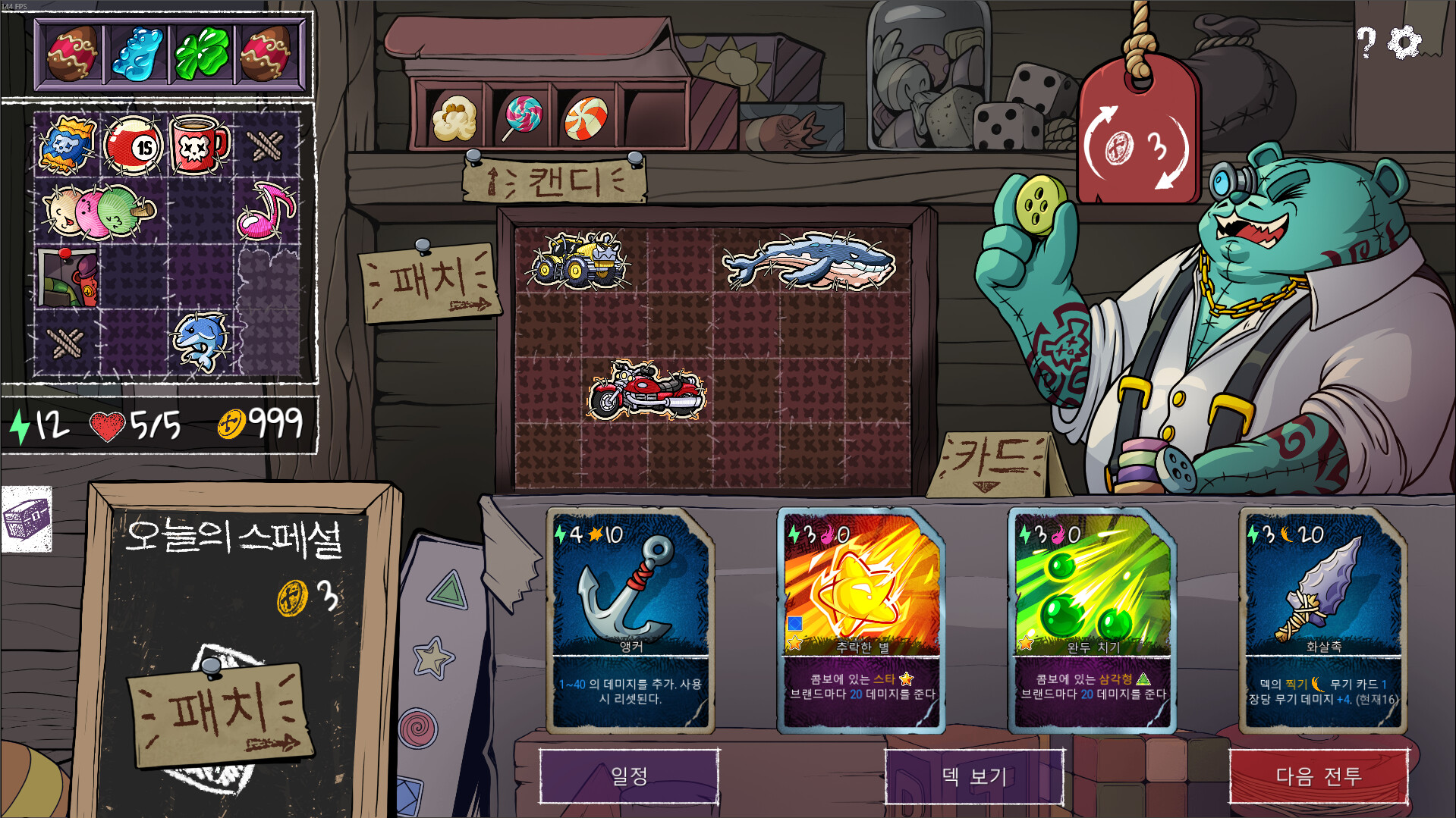 전투에서 얻은 골드로 강력한 무기, 스킬 카드, 곰돌이 사탕 등을 구매할 수 있으며, 이미 보유한 카드도 직접 업그레이드·제거·복제·강화하여 완전히 새로운 전술적 효과를 부여할 수 있습니다.
