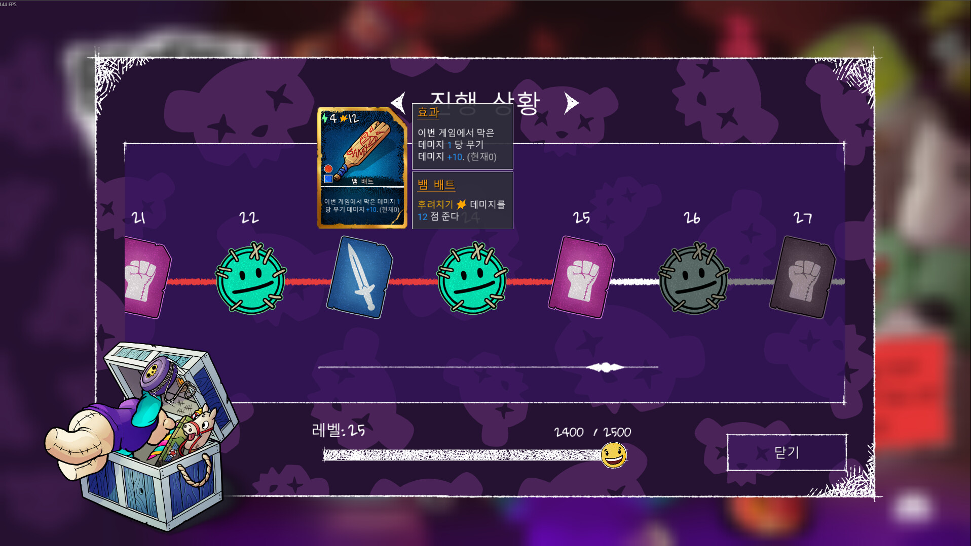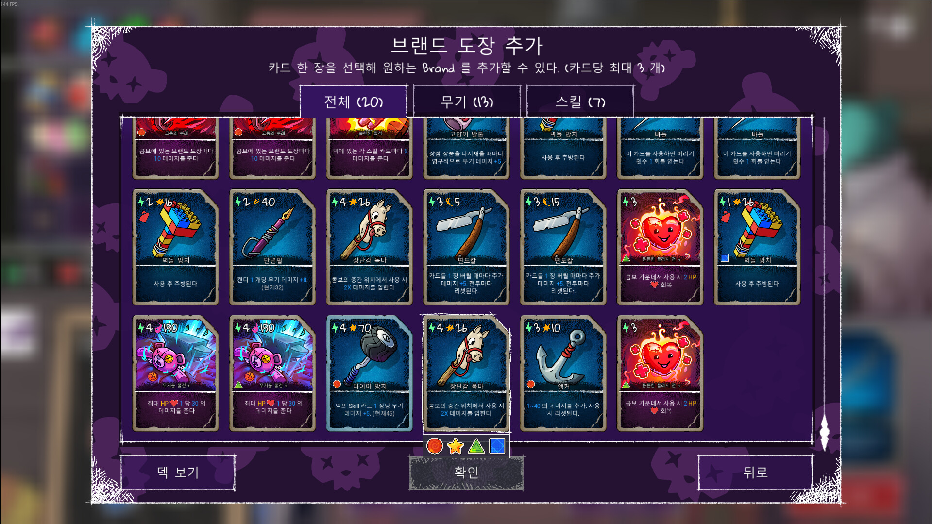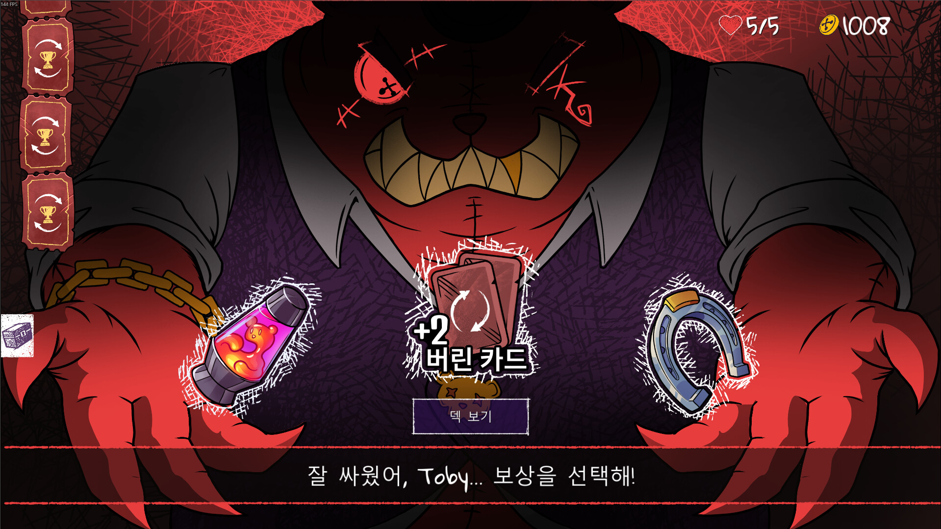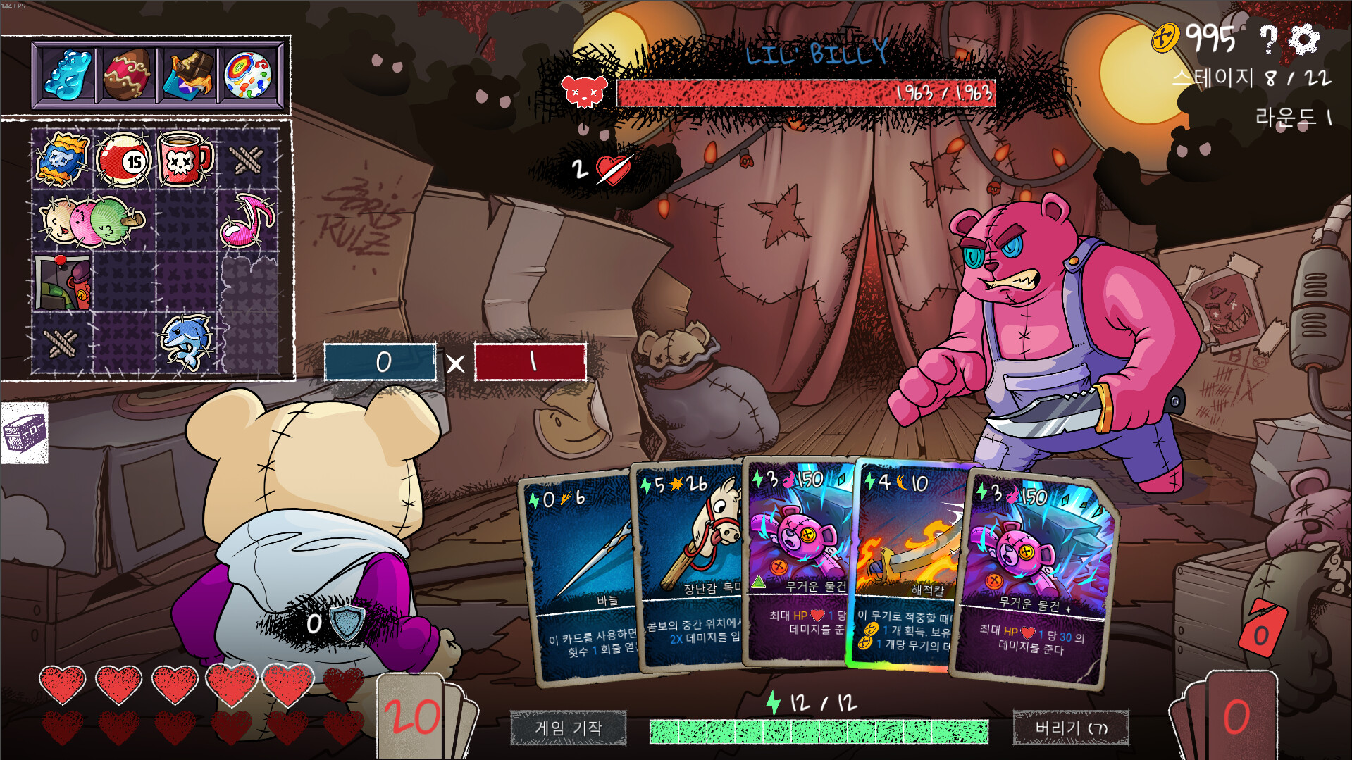 전투에서 얻은 골드로 강력한 무기, 스킬 카드, 곰돌이 사탕 등을 구매할 수 있으며, 이미 보유한 카드도 직접 업그레이드·제거·복제·강화하여 완전히 새로운 전술적 효과를 부여할 수 있습니다.