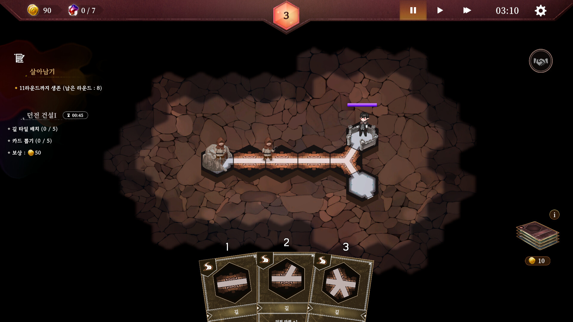 아직 개선의 여지가 있지만 재미있고 생각보다 머리 써야 하는 전략게임입니다 대충 주는 카드를 잇기만 하면 어느 새 도망칠 길이 막혀버리고, 큰 몬스터도 소환 못하는 상태가 되어 버리더라고요 캐릭터들도 매력있고 그들의 대화가 이 게임에 활기를 더해줘서 좋았습니다. 앞서 해보기 게임이지만 믿고 계속 하고 싶네요 정식 완성되는 걸 보고싶어요 팁이 있다면 마왕을 계속 움직이는걸 멈추지 마세요 못깰걸 깨게 해줍니다
