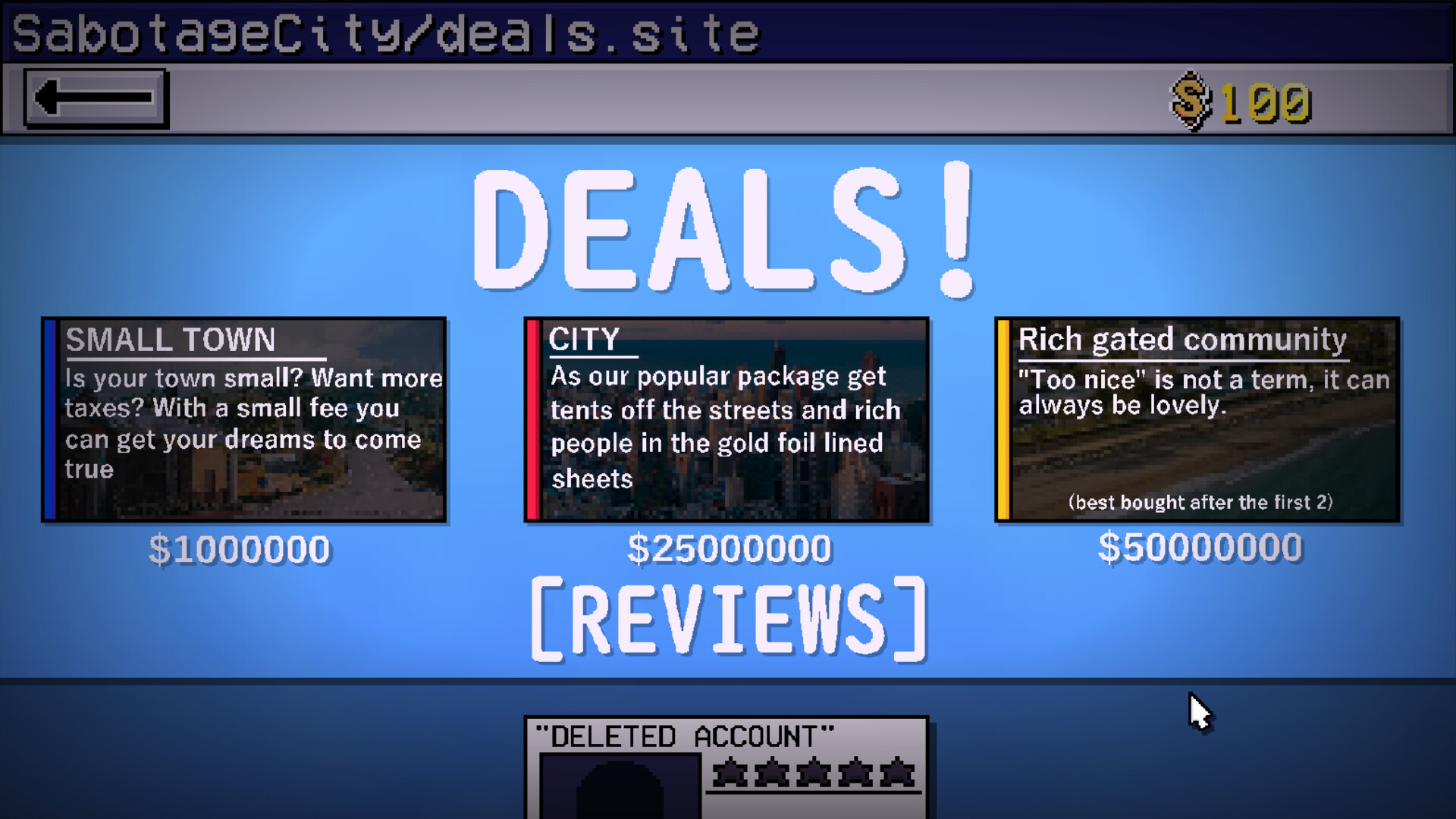 Web 1.0 web page inspired menus and shops. Instead of a normal shop menu the game uses a computer with charming 90s style websites that give advice on how to get better, helps you buy tickets to the cities you destroy, and give backstory to the world of the game.