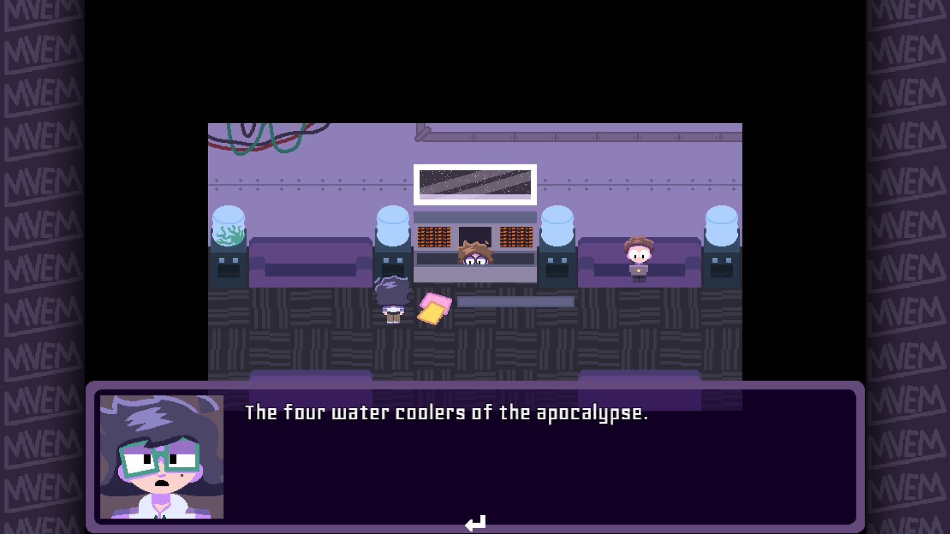 BACKSPACE (in all caps for some reason) is an adventure/puzzle game where you start your new job as an intern for the space vessel manufacturing company, MVEM! While getting settled in at your new job and meeting the office's odd cast of characters, you may get a sense that something strange is going on...