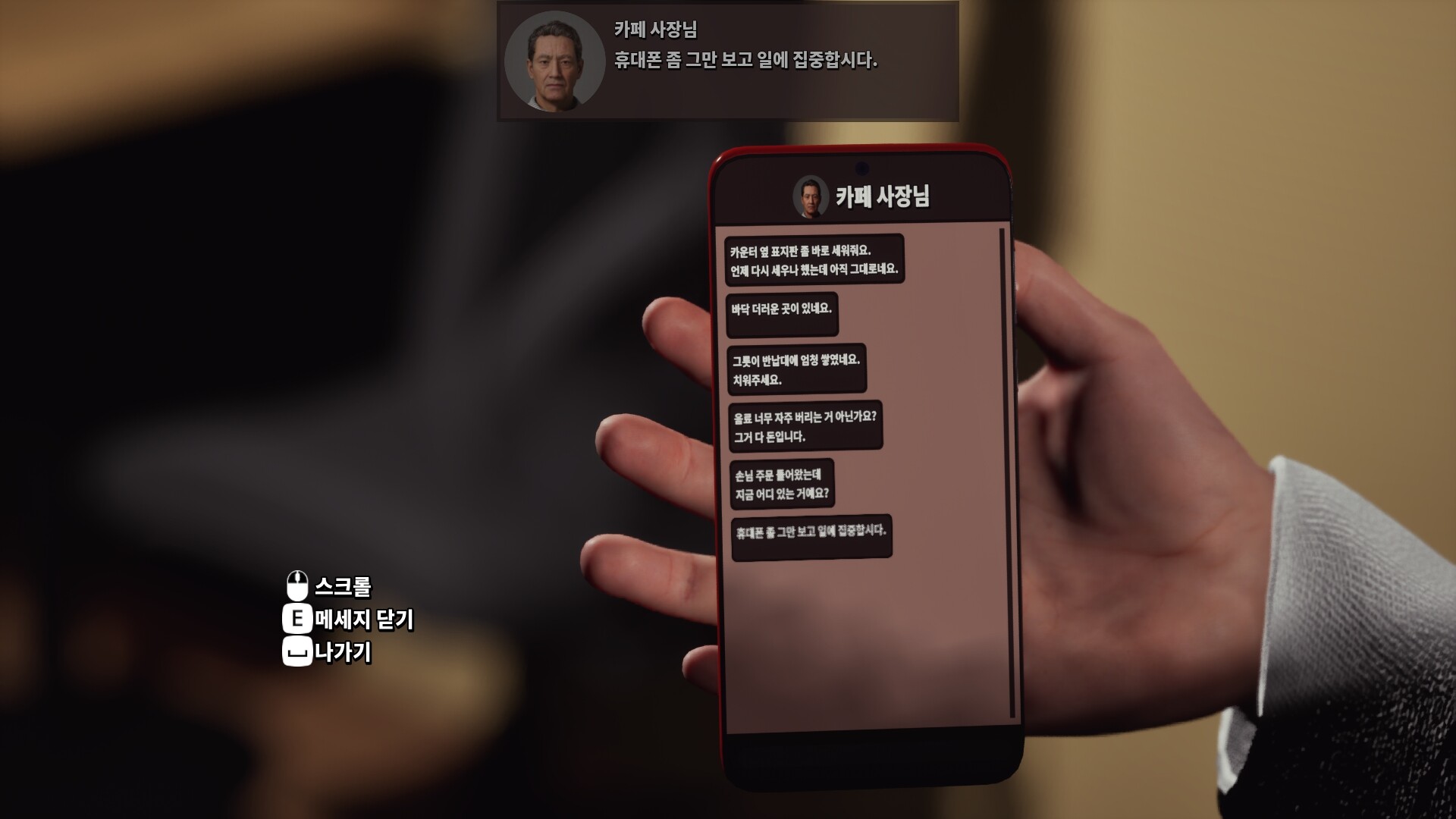 카페 아르바이트 처음 해보는데 재밌네요. 게임은 재밌습니다! 스토리도 나름 짜임새 있구요. 다만, 이전 타임 알바가 정리 안하고 퇴근하는 게 너무 괘씸하고 손놈들이 카운터 옆에 세워둔 거 계속 넘어뜨릴 때마다 뒤통수 한 대 마렵습니다..