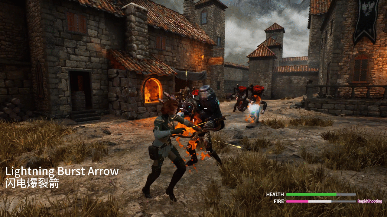 The female protagonist has four types of bow attacks: normal arrow, charged arrow, rapid-fire arrow, and lightning burst arrow.