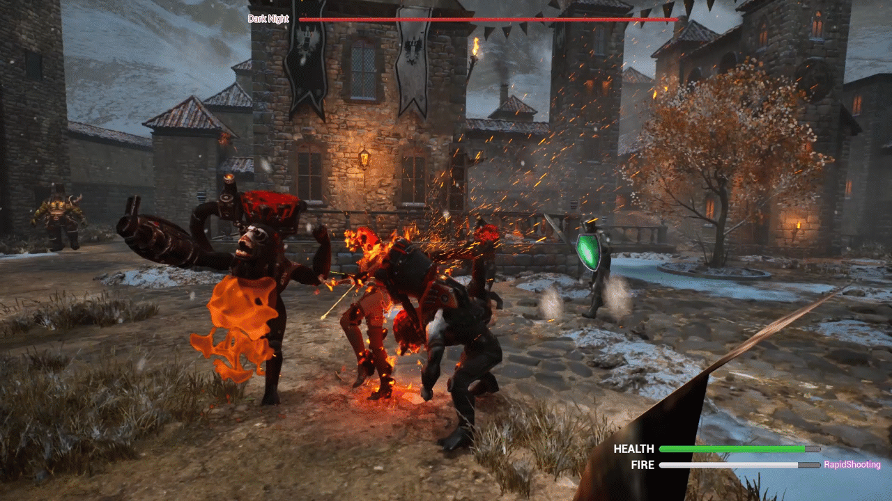 The Dark Night Warrior, clad in full armor and equipped with a shield, can dodge your arrows, making him a tough opponent. However, he is vulnerable to flying kick attacks. A flying kick from his side or rear can deal significant damage, and the player can regain health and increase firepower.