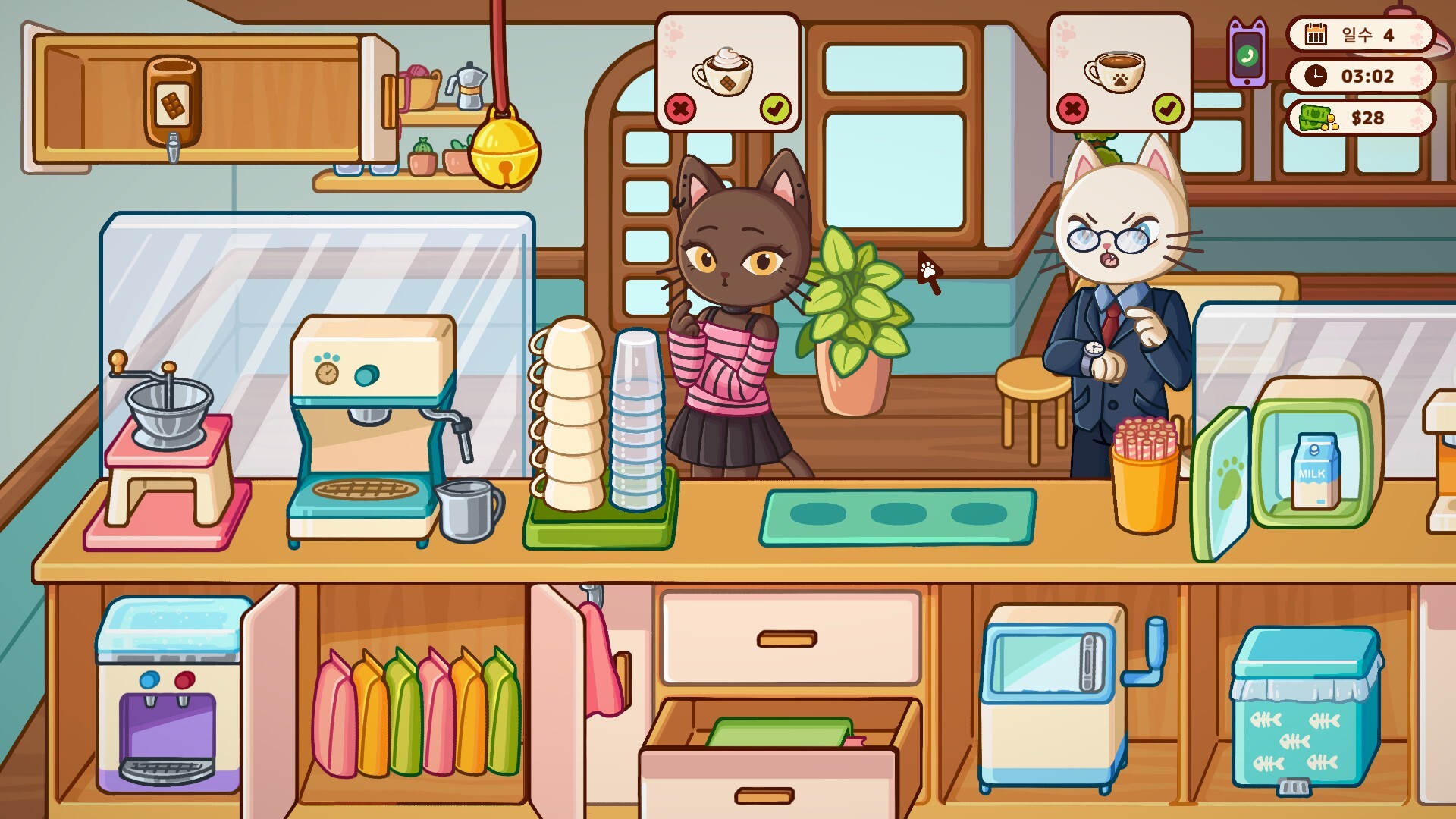 영업 준비 되셨나요? 앞치마를 두르고, 에스프레소 머신을 예열하고, 재료를 준비한 후, 사랑스러운 고양이 손님들을 맞이하세요. 디저트, 음료, 고양이들과의 따뜻한 우정이 기다리고 있는 "Cats&Cups"에서 여유로운 시간을 보내세요!