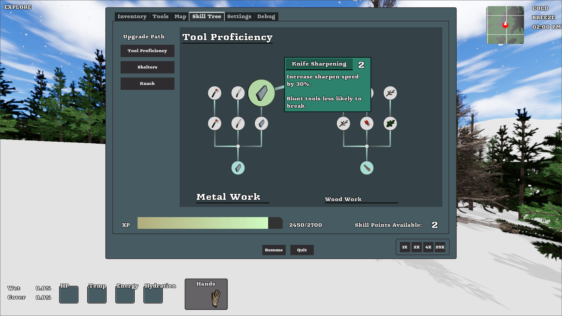 Permanent skill tree progression allows you to build on your skills and knowledge, gaining access to new shelter types, tools, and skills.