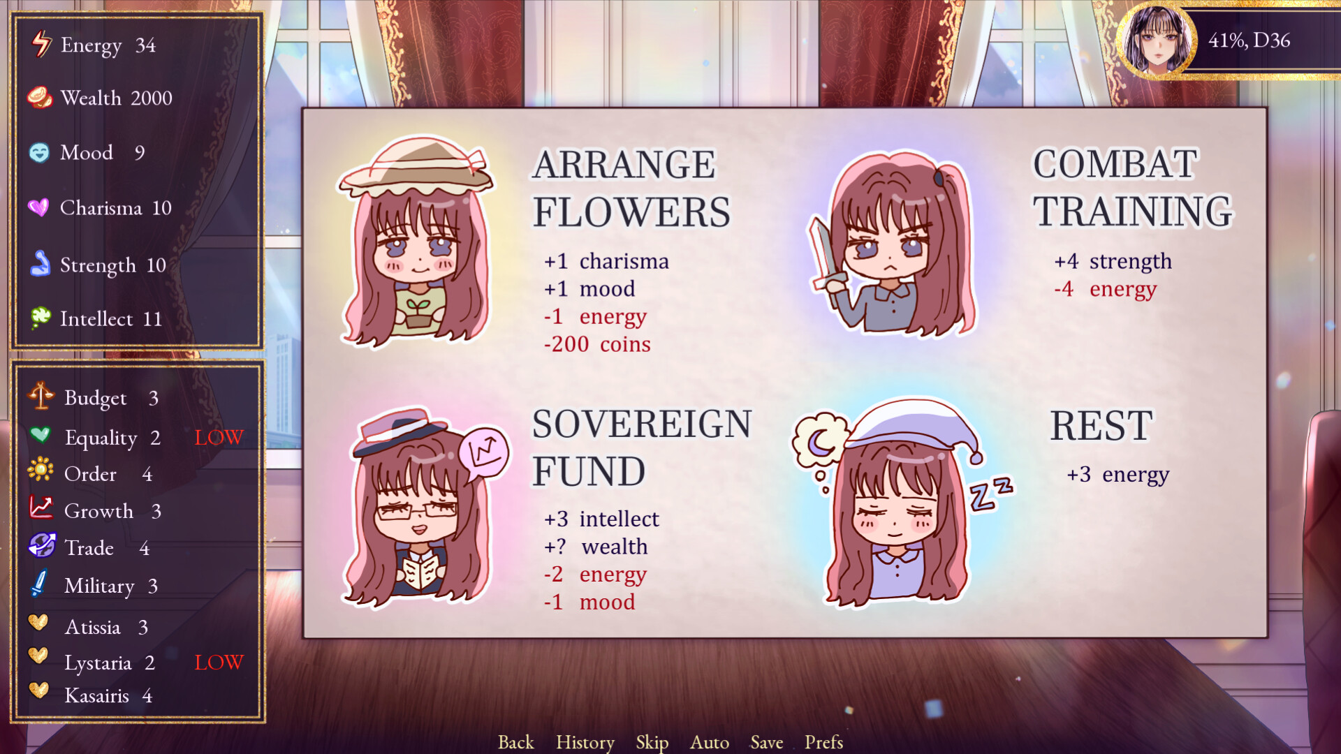 Every decision will affect various stats, whether it's your personal skills, the country's domestic issues or foreign relations. These stats determine the story and future choices that you will get. Think carefully about your priorities as each decision has its trade-offs!