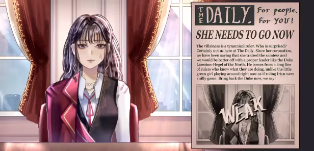 The land of Iriyn is riddled with issues like a stagnant economy, shaky foreign relations, and a dissatisfied public. You can try to fix these, or make it worse for the sake of chasing personal wealth and power. Your choices will determine what happens to the world, and what people say about you. Beware of the 'scandal sheet' newspapers that try to slander you!