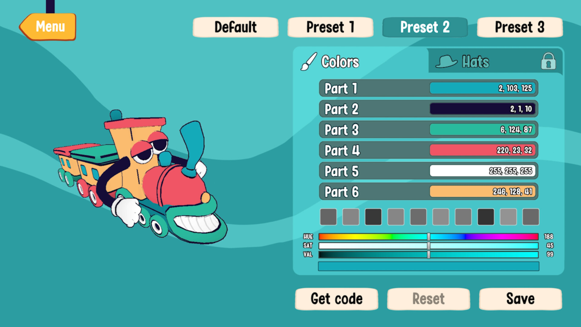 Customize the little gung-ho engine to your own style using the customization menu. Colors and hats galore!