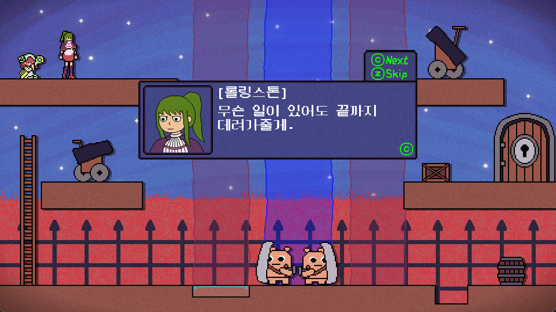 Sugar & Rolling Stone 스프링의 점프 판정, 대포의 발사 궤적, 슈가와의 상호작용 등등.. 모든 오브젝트의 쓰임새와 시너지를 극한까지 활용하고, 사소한 메커니즘까지 전부 이해해야 전부 클리어 할 수 있다 때론 1프레임, 1픽셀 단위의 마이크로 컨트롤이나 꼼수가 통하지만 정답이 그거 하나밖에 없는 것을 보면 의도한건가 싶기도 하고? 조작감이나 히트박스, 버그 같이 다듬어야 할 요소는 많지만, 그것들을 하나씩 제외하면 남게 되는 퍼즐 게임의 핵심 요소인 레벨 디자인 측면에서의 참신한 아이디어는 고평가 하고 싶음 반복해서 오래 들어도 좋은 BGM과 묘하게 매력있는 아트도 강점 무슨 일이 있어도 끝까지 데려가줄게...