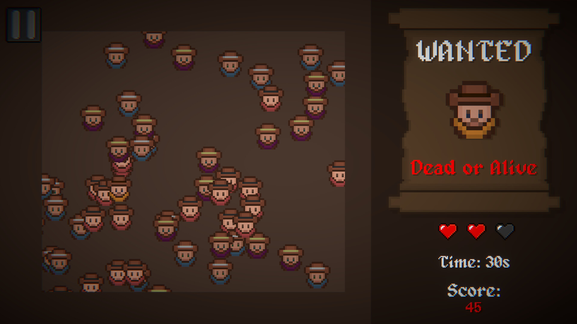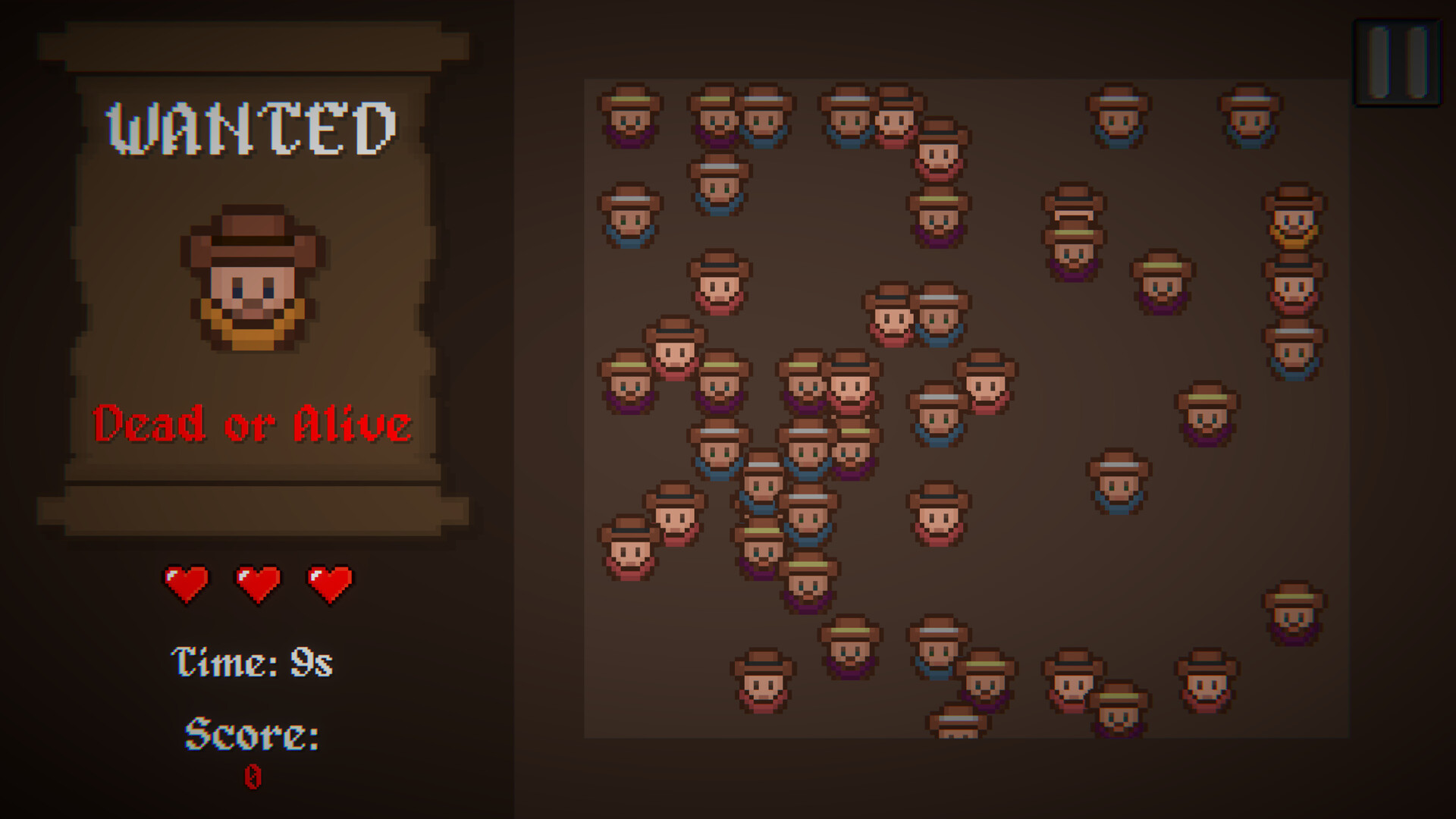 Step into the Wild West with Wanted: Dead or Alive, a fast-paced puzzle game that will put your observation skills to the test. Your mission: spot the wanted outlaw among a crowd of ever-moving cowboys. As you progress, the challenge intensifies—time speeds up, and a single mistake could cost you your bounty. With its simple yet addictive gameplay, Wanted: Dead or Alive will push your reflexes and focus to the limit. Can you catch all the bandits before they vanish into the crowd?