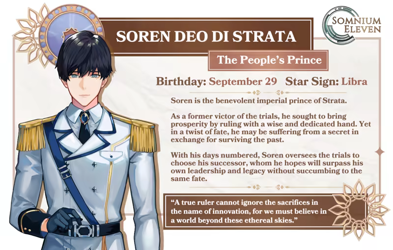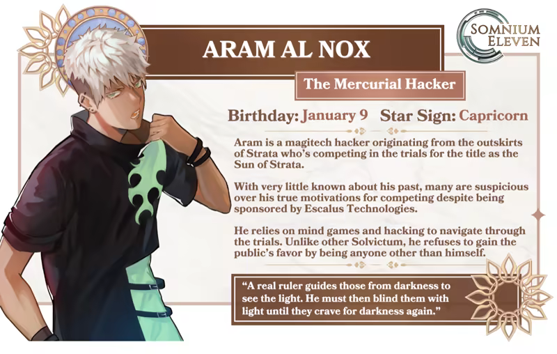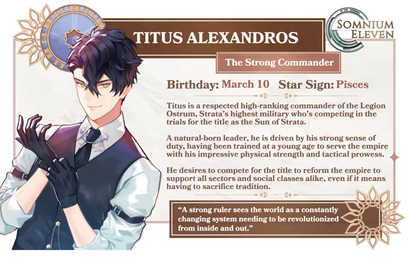 “Somnium Eleven” is an anime, choice-driven magitech otome simulation game where you can bond and interact with fellow competitors and four romance-able characters to unlock private messages, social media content, and romantic scenarios in the story!