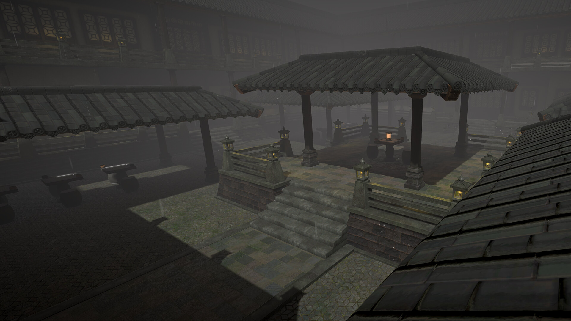 This rainy courtyard is inspired by a notable scene in Jet Li's Hero (2002), and features a spinning training dummy and rooftops that can be reached by jumping. Clash with opponents within the dimly-lit halls or out in the open court area!