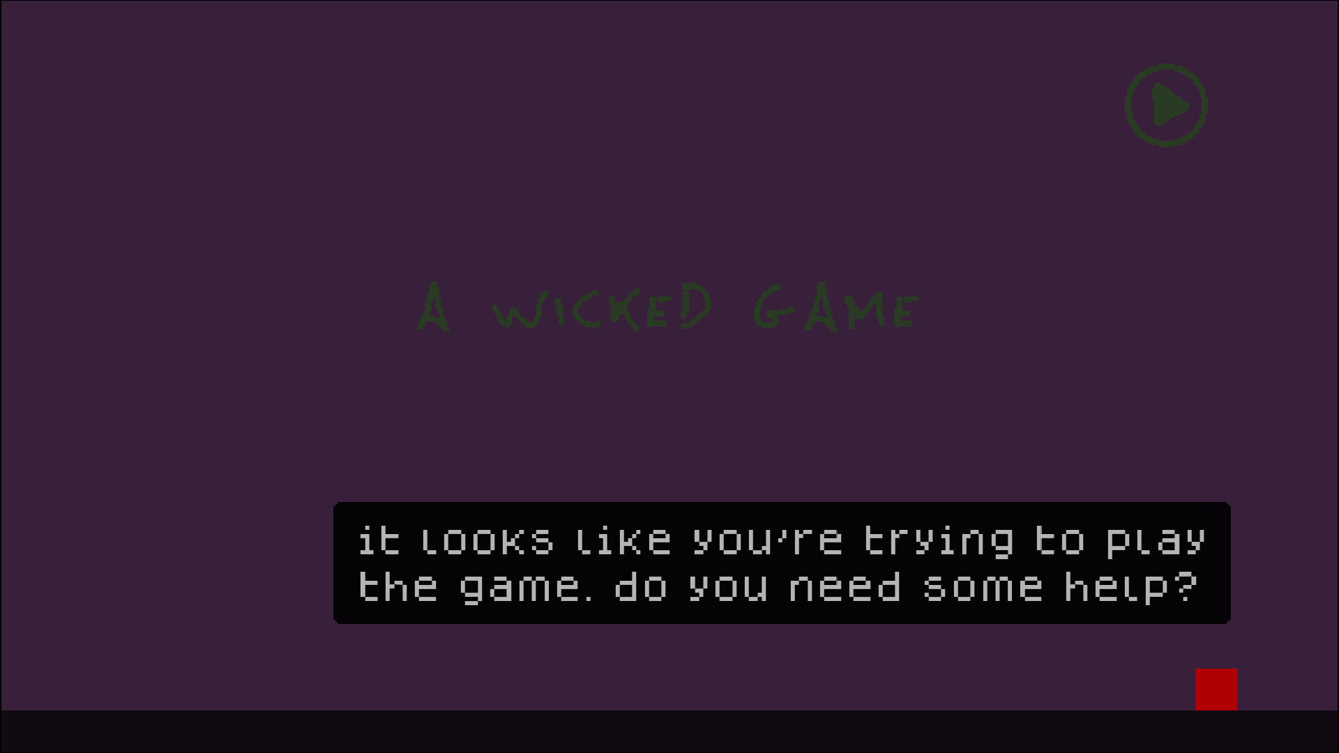 This is the demo for A Wicked Game! In A Wicked Game, the rules are unclear or incomplete. There may or may not be feedback. Patterns will be hard to find. It demands the player know things which are never taught, demands that they contort themselves to a constantly-changing control scheme, and success requires mastery combined with luck. The characters you meet are deliberately inhospitable. They are impatient, rude, and inconsistent. They will help you and harm you, but it will be unclear which is happening. Trust is hard to find here.