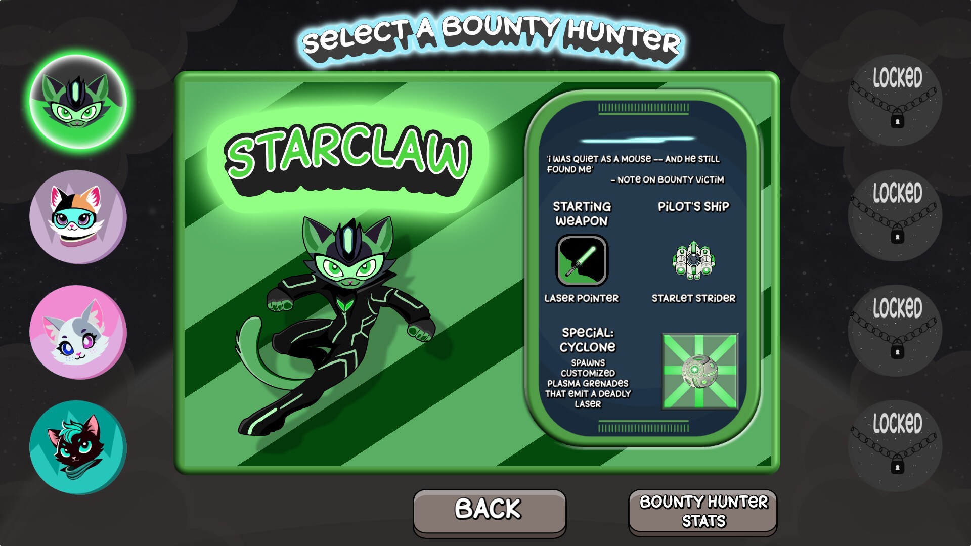 Become the Cat Bounty Hunter. Blast off through deep space as you decimate hordes of space creatures with bounties on their heads. Upgrade unique cat-themed abilities, unlock pulverizing weapons, and survive until your contract expires -- or join the ranks of fallen bounty hunters before you.