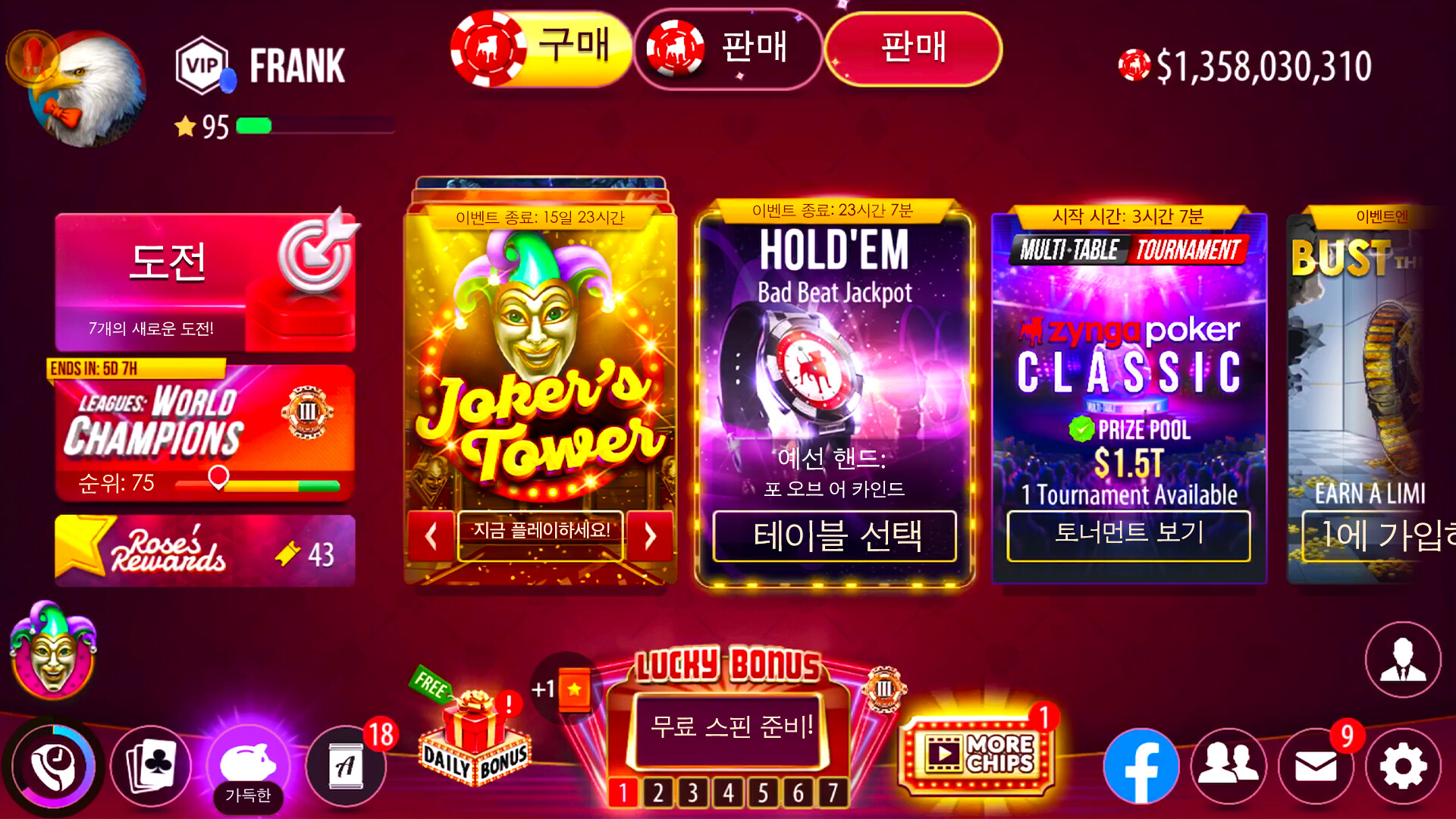 친구들에게 포커 게임을 도전하고, 포커 페이스를 연습하며, 온라인에서 새로운 친구들을 만나고 포커 스타가 되어보세요! Zynga Poker는 포커 게임 중에서 가장 강력한 유저 커뮤니티를 자랑합니다.