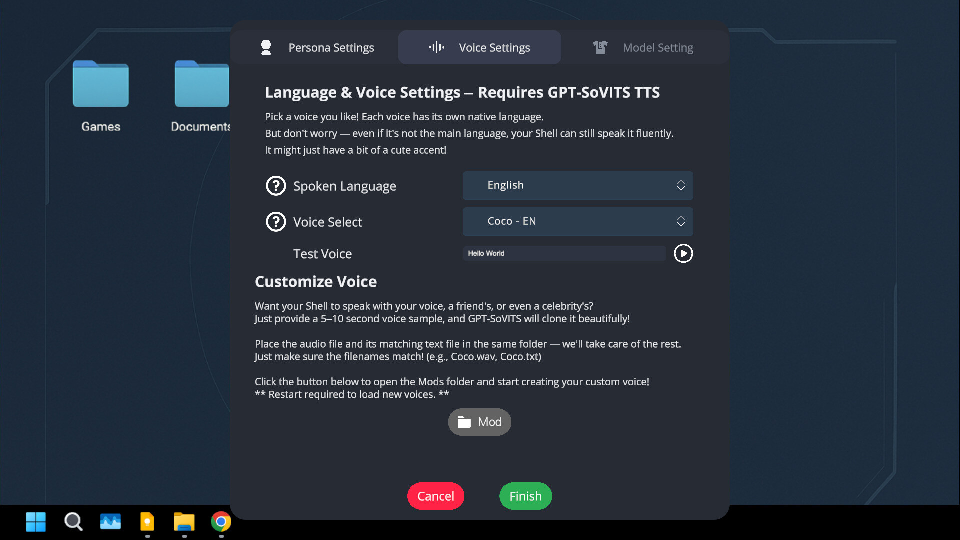 TTS voice synthesis support — choose from built-in voices or set a custom one