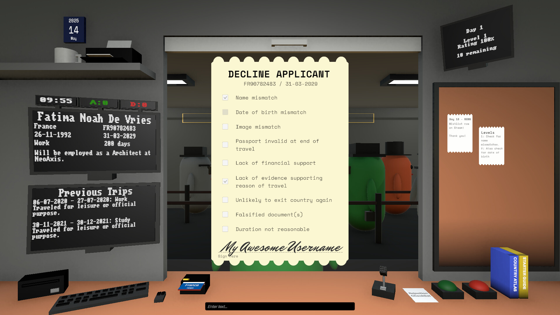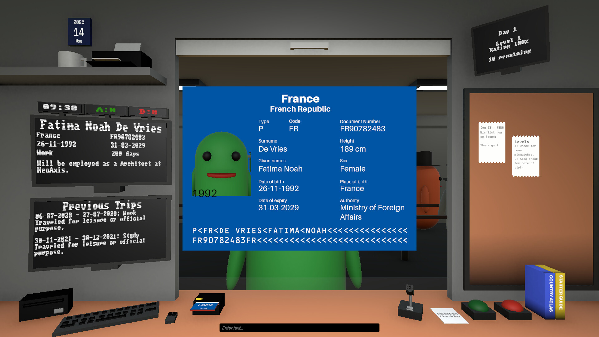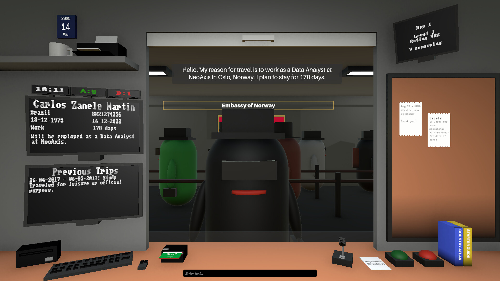 In Embassy Says No, you play the role of an immigration officer working at your country's embassy. Your job is to interview visa applicants and decide who gets approved and who doesn't. Some will meet the criteria perfectly. Others might try to deceive you.