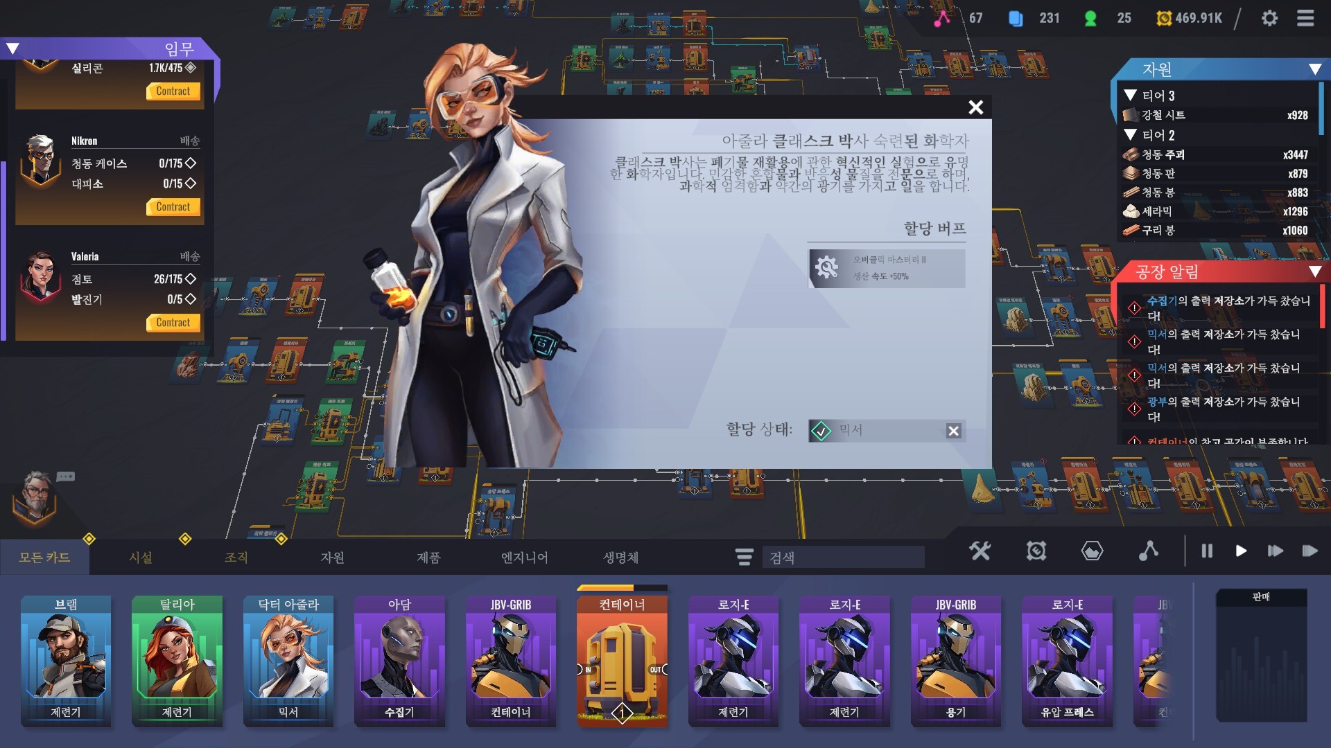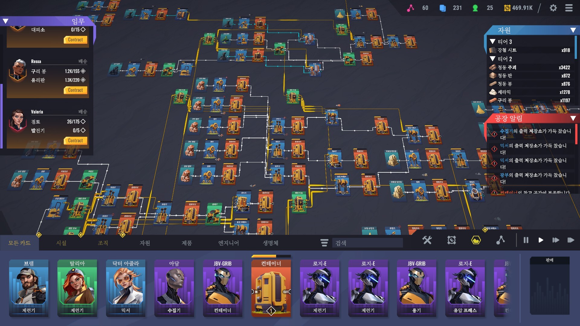 공장 + 카드를 꽤 성공적으로 합쳤다고 보여짐 비슷한 카테고리를 선호하는 사람들은 한 번쯤 찍먹해도 좋을듯 얼리 엑세스인 점을 감안하더라도 충분히 돈값은 함 디스코드에서 실시간으로 버그 리포트와 피드백을 할 수 있고 빠르게 핫픽스 패치를 진행해주었음 최적화나 렉에 대해 다소 아쉬운 부분이 있는데 임시방편으로 게임을 껐다 키면 다시 쾌적해짐 문외한이라 잘은 모르겠지만 전력 사용량이 누적해서 메모리를 잡아먹는 느낌? 아니면 창고가 가득차서 알림이 켜졌다 꺼졌다를 틱마다 반복하는데 그게 문제인 것 같기도 함 초반에는 이것 저것 신기해서 만들다가 Tier3쯤 가면 공정마다 최적화하고 렉을 줄이기 위해 생산량과 소모량을 일치시키고 컨테이너를 점점 사용하지 않는 방향으로 가게 됨