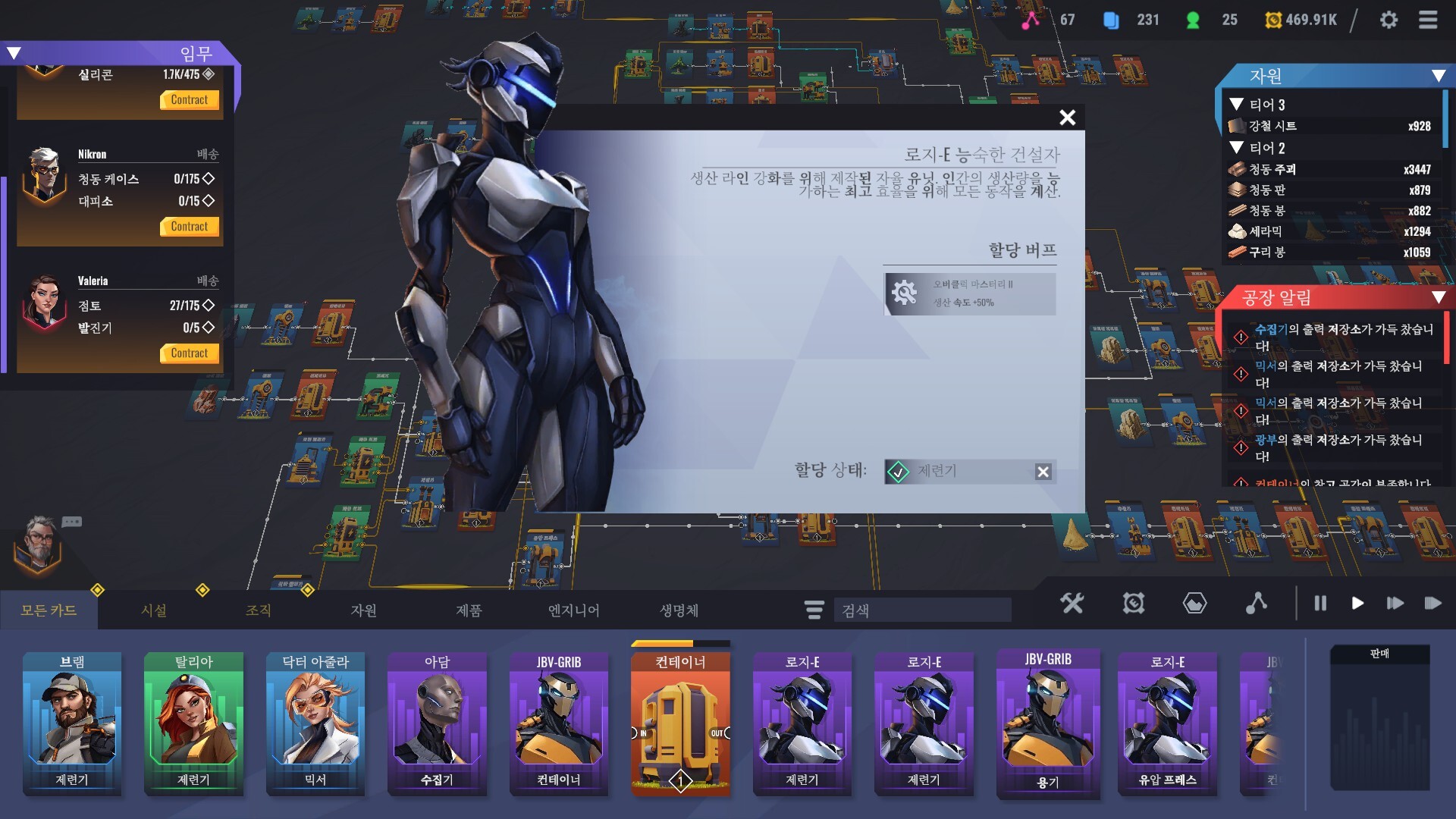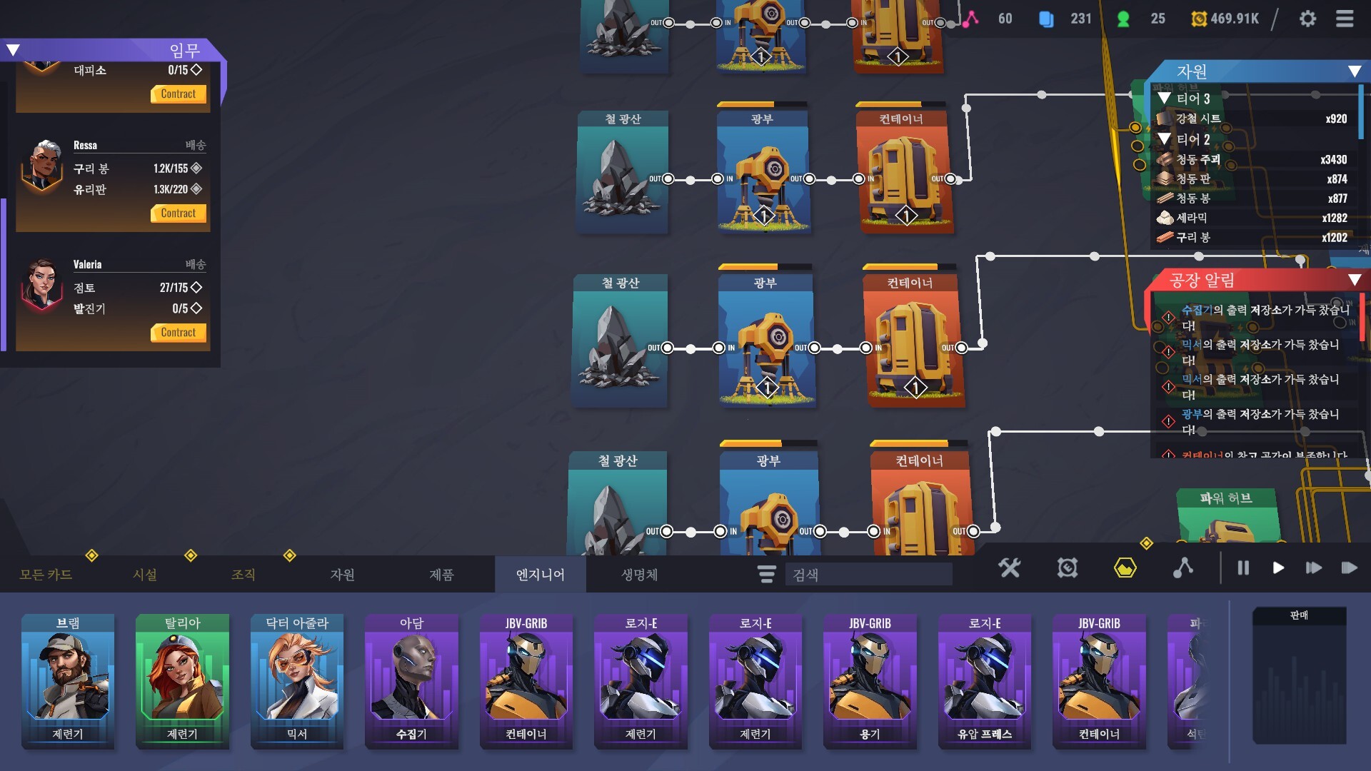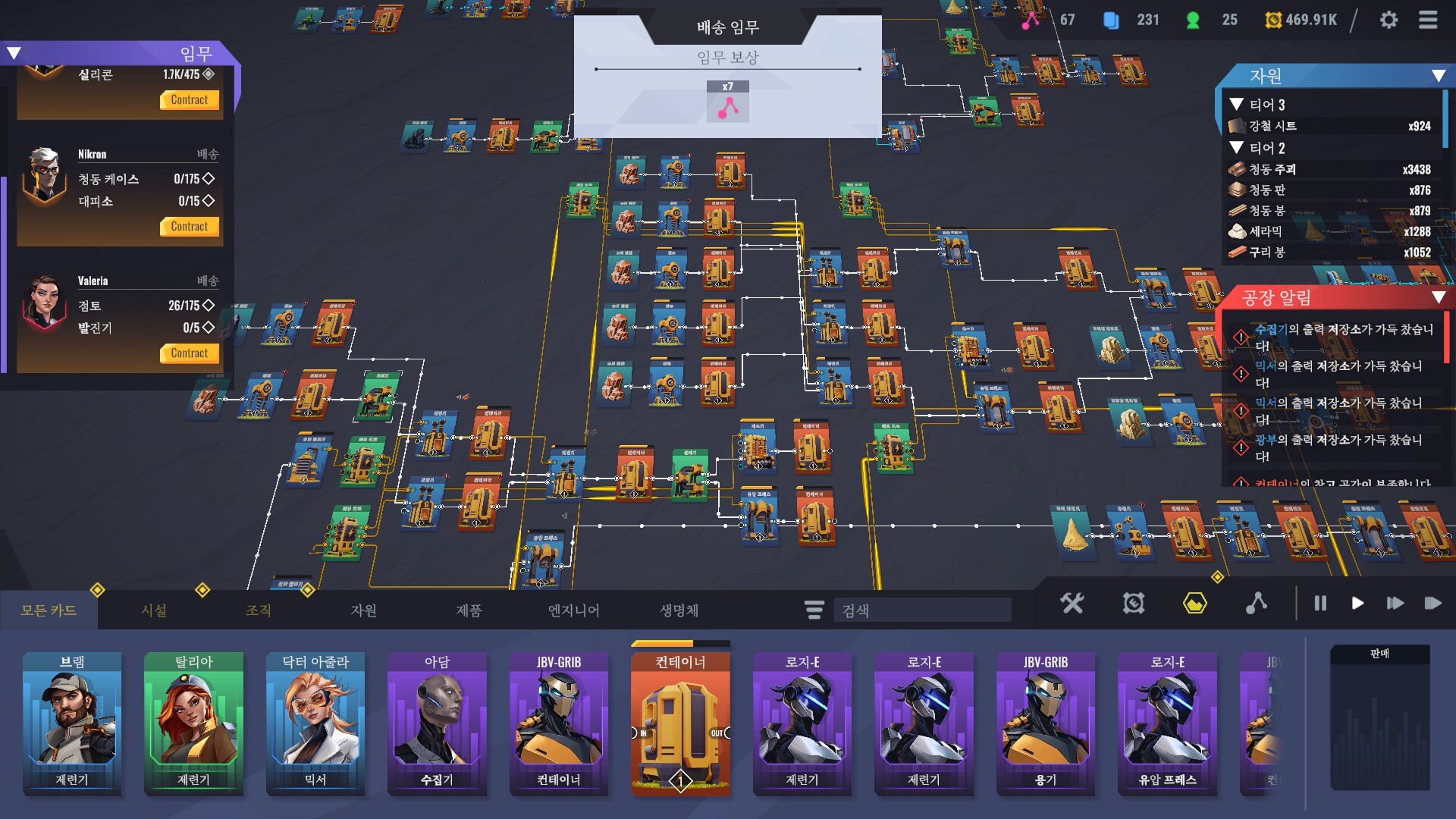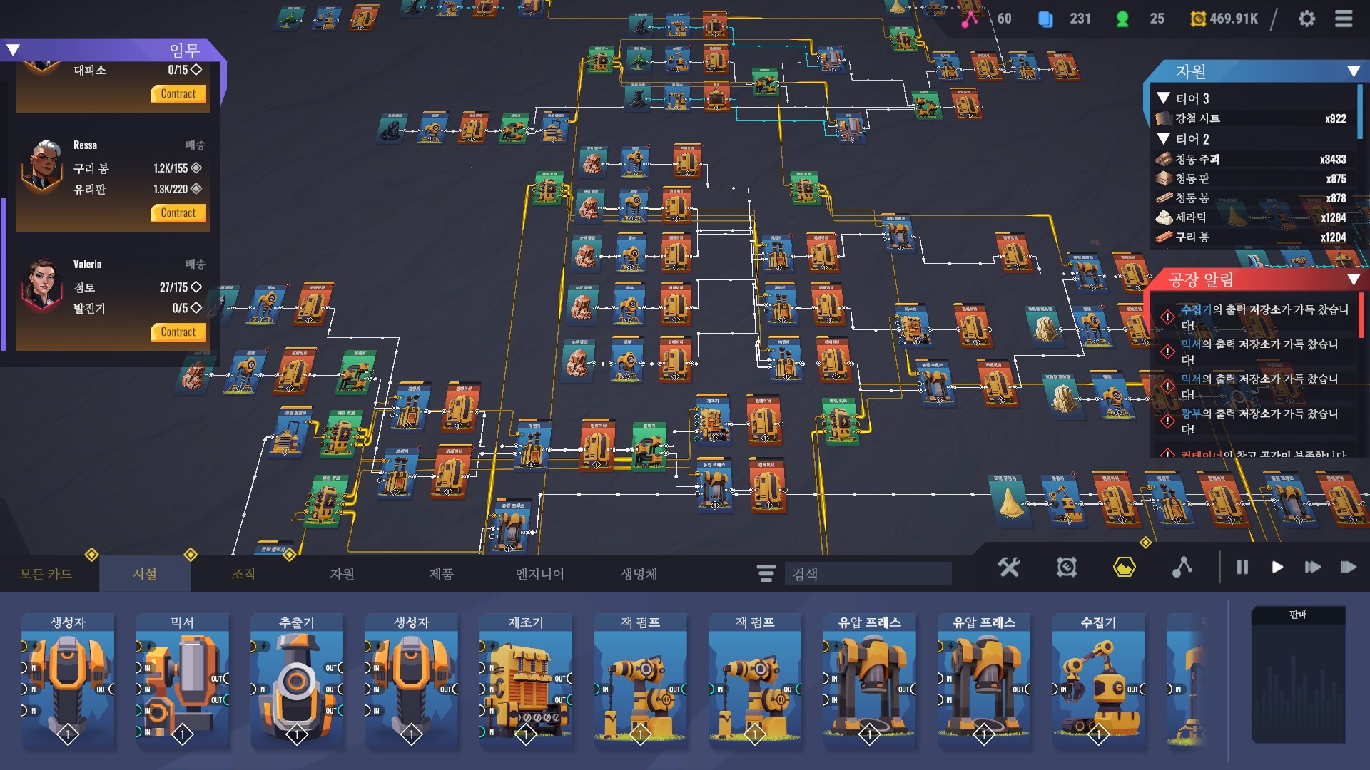 재료, 산물, 액체, 전력 등이 모두 노드 방식으로 연결되어 물질 흐름을 한눈에 파악할 수 있습니다. 설계와 배선의 타당성을 끊임없이 검증하고 전체 생산 효율을 높여, 공장이 질서정연하게 운영되도록 하세요.