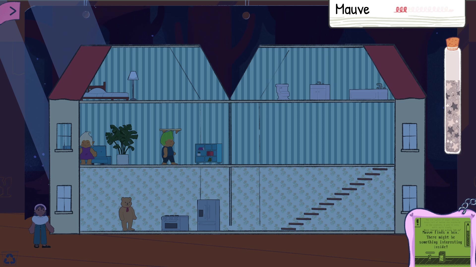 In DIGI-DOLL, a relaxing decorating simulator, Mauve, a vintage collectible doll, is freed from her box and discovers a huge dollhouse waiting to be filled with friends. Use the virtual DIGI-DOLL to explore the collector's attic, make friends, and discover furnishings and abilities!