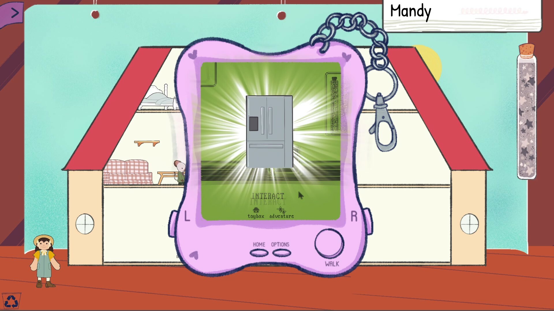Explore the world through the retro DIGI-DOLL console, a clicker minigame, where the text-based choices you make determine the decor and characters you'll have in the real world. Customize your home with furniture and friends to make it truly your own!