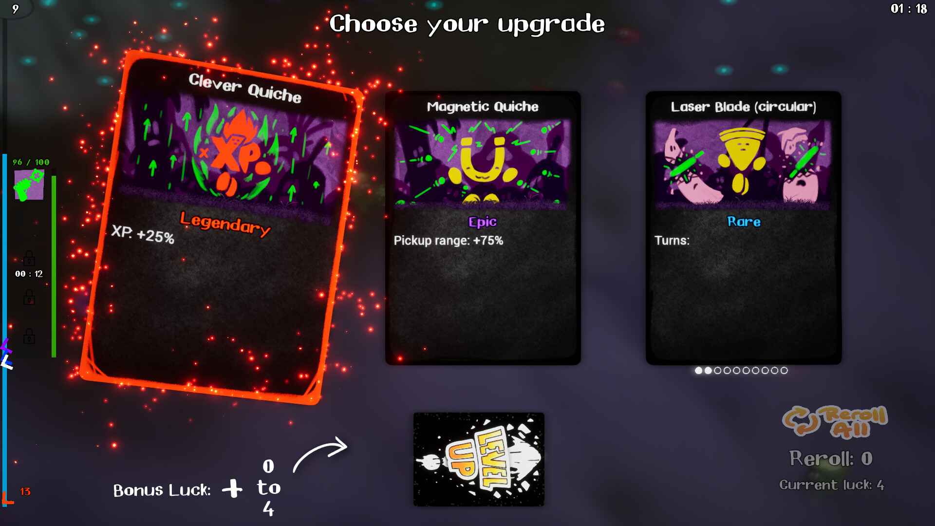 Gain power to pulverize hordes of rotten food. Play as iconic characters, referencing various pop culture universes, with their own unique skills, and complete the ultimate battle of Kichman, the last slice of quiche that can unite all powers!