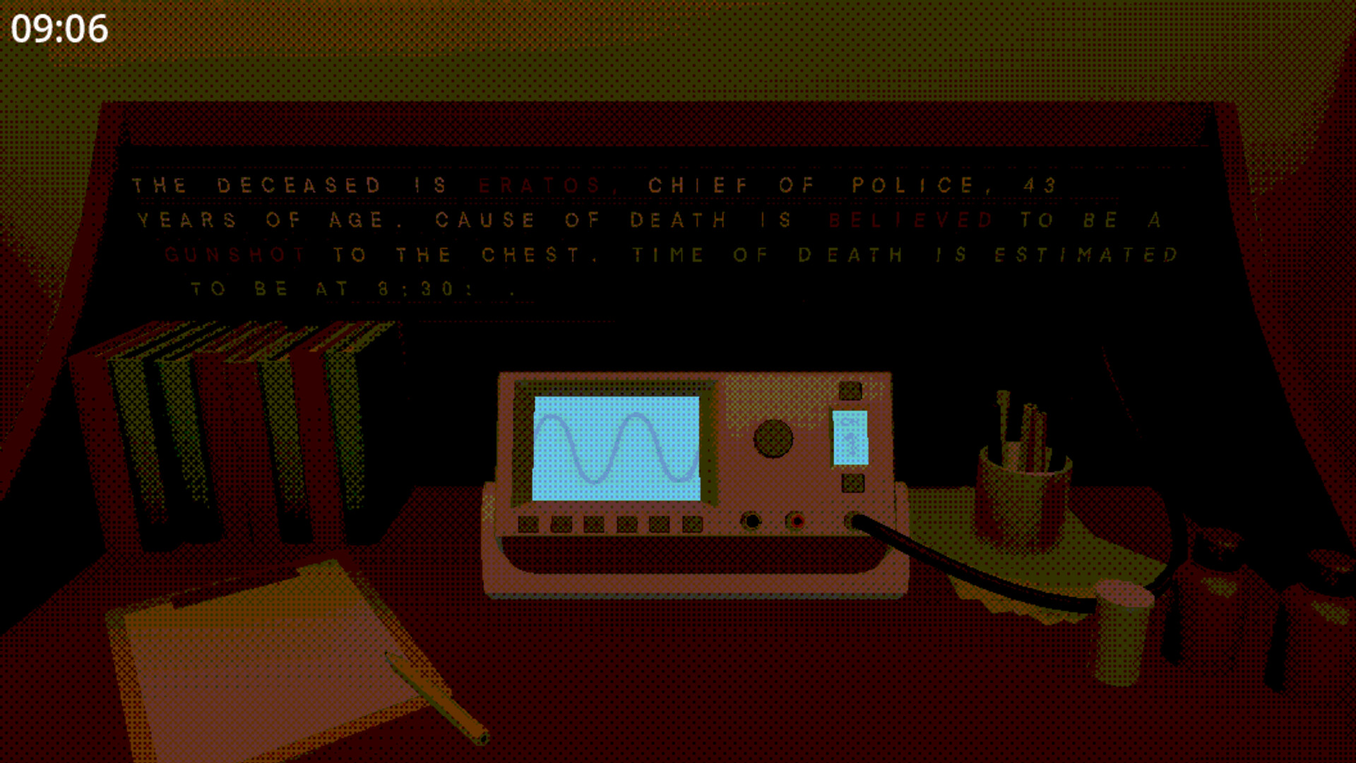 "The deceased is Eratos, Chief of Police, 43 years of age. Cause of death is believed to be a gunshot to the chest. Time of death is estimated to be at 8:30. Click. That should do it, let's get started..."