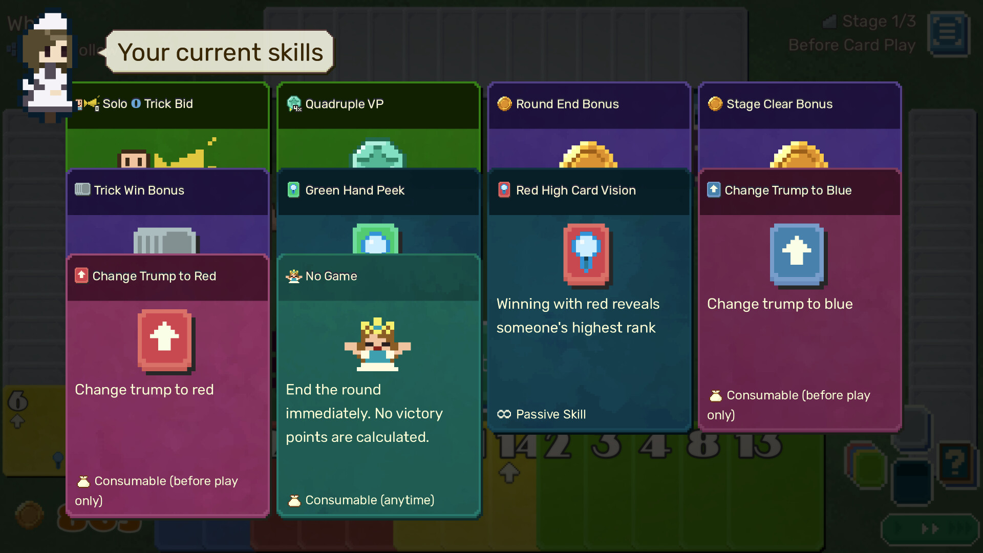 Trick-Taking × Roguelike! Trick-taking games fused with roguelike elements like skills and shops! Features 9 trick-taking games including Spades, Oh Hell, and Schnapsen!