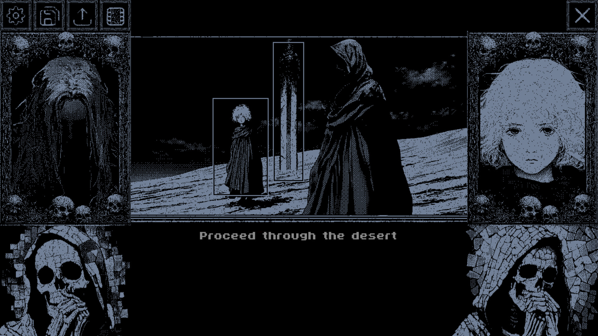 In this dark interactive novel you will play as a lost soul wandering a forsaken desert, accompanied by a mysterious girl. Explore ancient ruins and face obscure choices. Your decisions will shape their journey—often in ways you’ll never fully understand. Will you find peace, or something else?