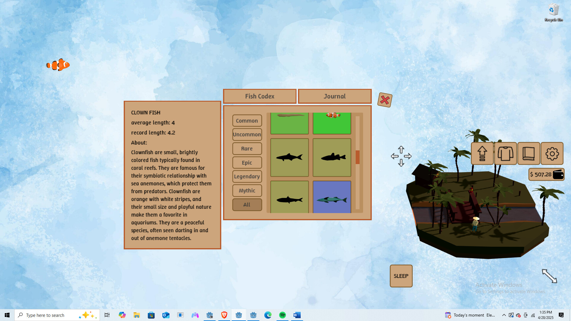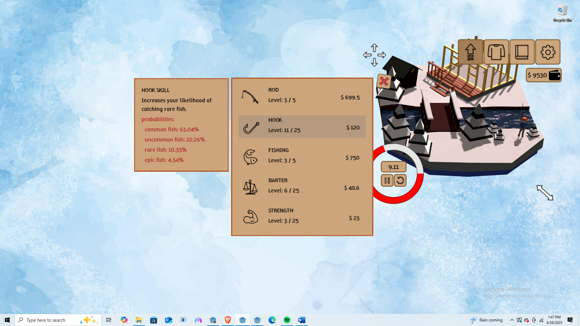 Welcome to the PomoFish Demo! PomoFish is a game that merges fishing and the Pomodoro studying technique! Work hard while Joe catches fish for you! Sell your fish to level up your skills and buy items.