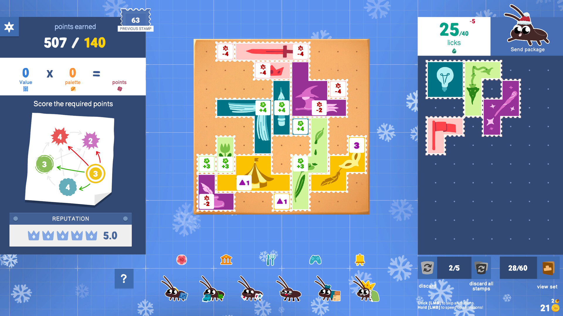 Before each run, you choose which stamps and cockroach workers to bring with you. Build your own strategy!