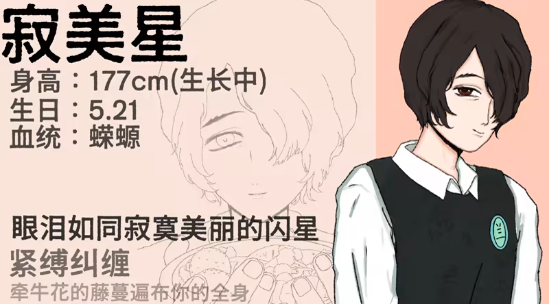Meixing Ji- He’s an orc with salamander-like abilities and can transform quite a bit. He’s a rich kid who just transferred to Orchid Middle School. His family doesn’t seem to care much about him, so he’s pretty quiet and shy. But don’t underestimate him—he’s incredibly persistent when he sets his mind on something. Once he latches onto you, it’s hard to shake him off. Kind of like morning glory vines that won’t let go unless... well, you know.