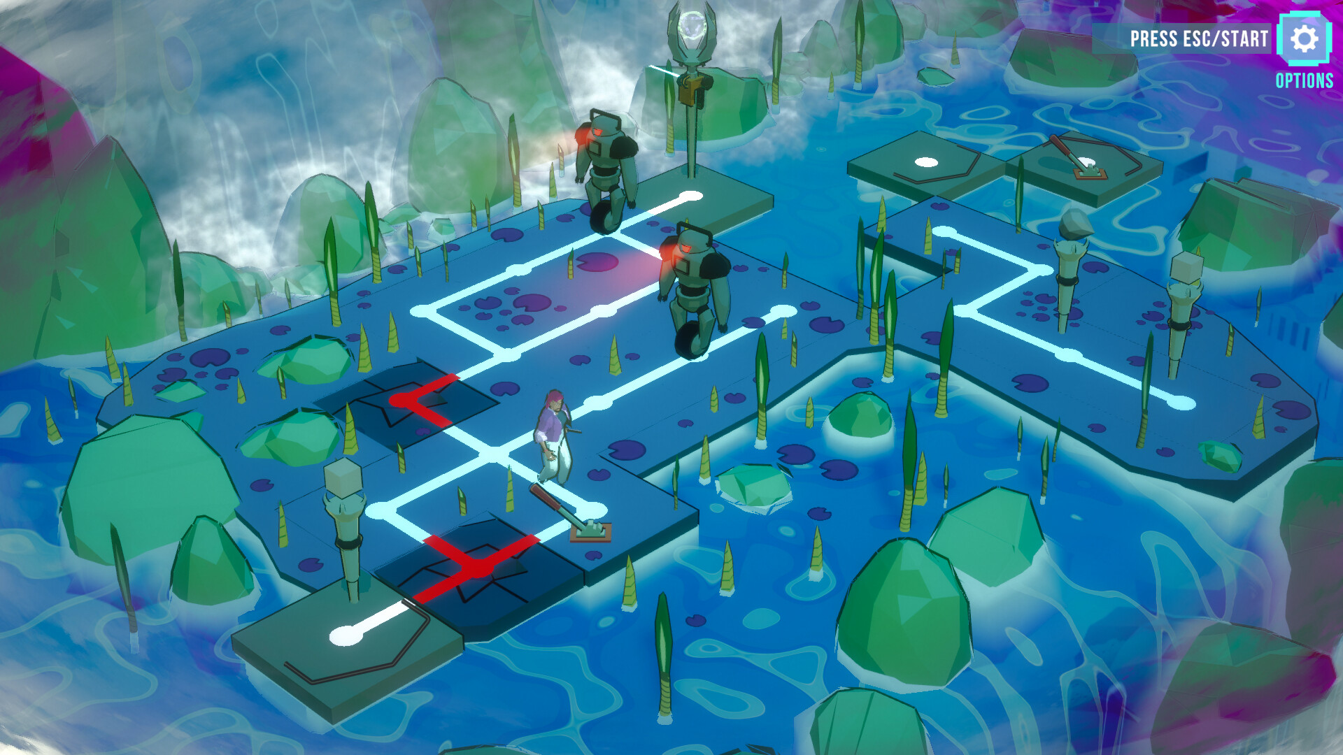 O.U.T.T. is a 3D turn-based puzzle-adventure game with a deep narrative, multiple endings, challenging puzzles with a retro futuristic cyber soulpunk aesthetic in a pre-dystopic future.