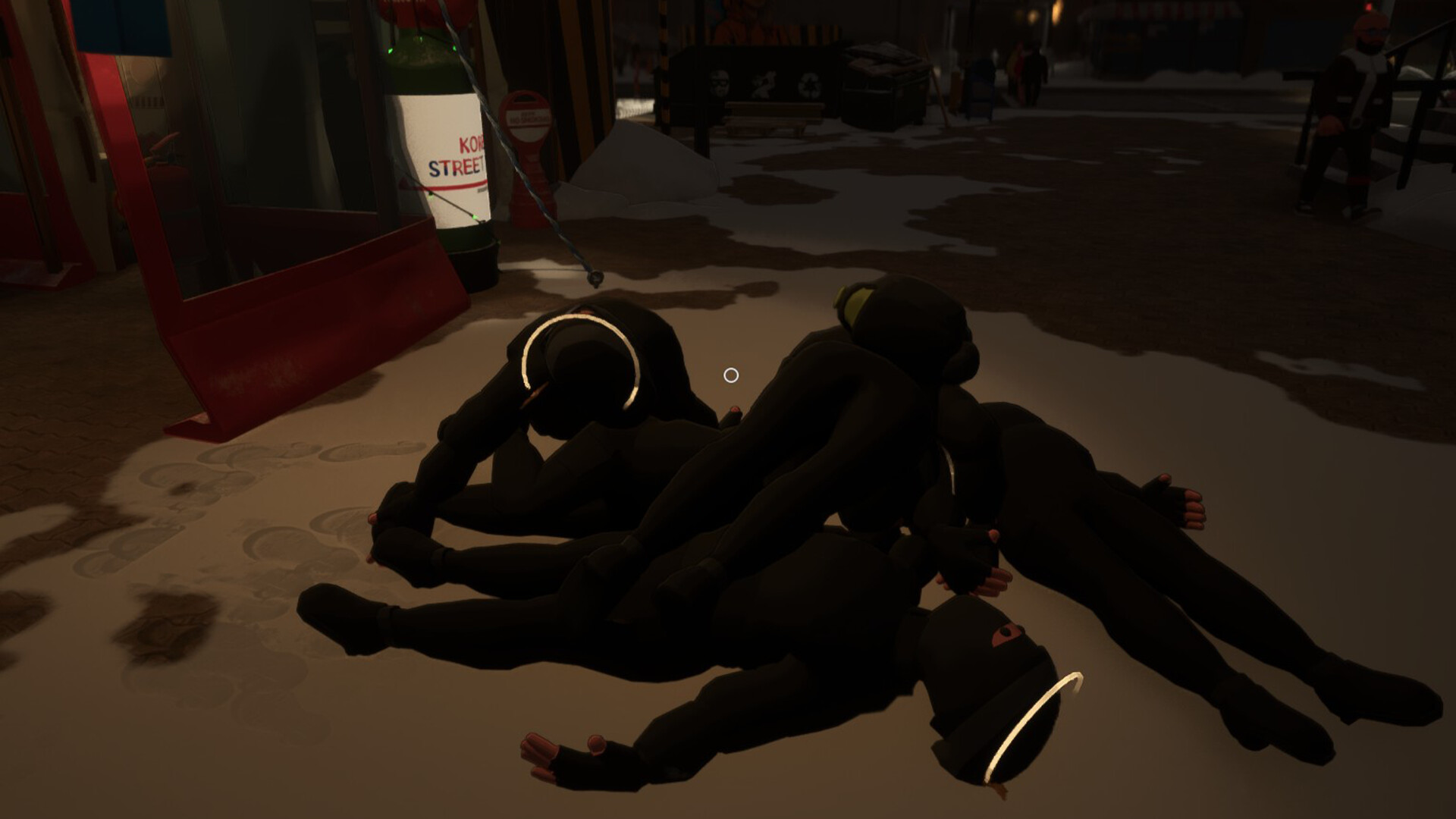 눈 내리는 어두운 고가도로 아래, 따뜻한 불빛을 따라 사람들이 하나둘 모여듭니다.