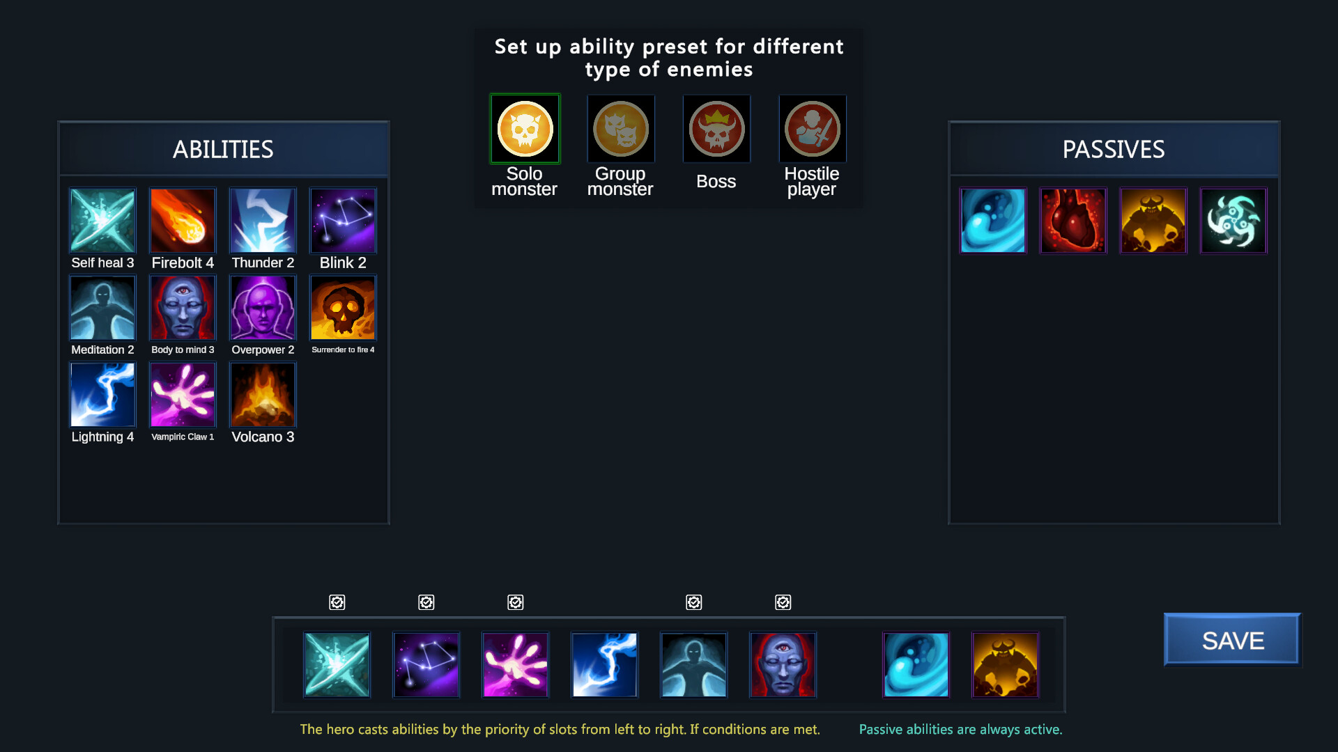 You define everything: combat style, priorities, reactions to danger, and long-term goals. Through smart automation, your hero acts independently, following the logic you design - from resource farming to tactical combat decisions.