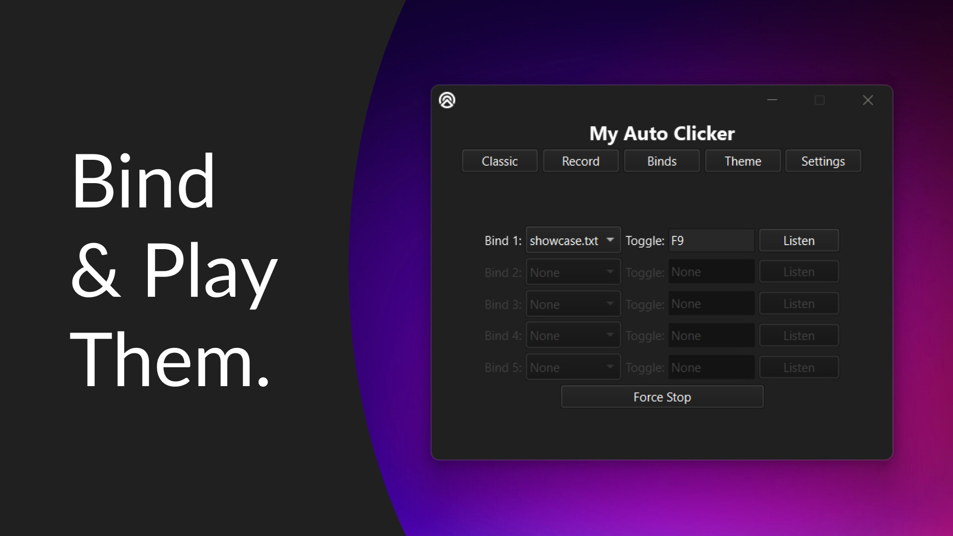 Turn your recorded actions into a toggleable playback bind. Assign a hotkey, tap it once to start the sequence, and tap again to stop—perfect for automation.