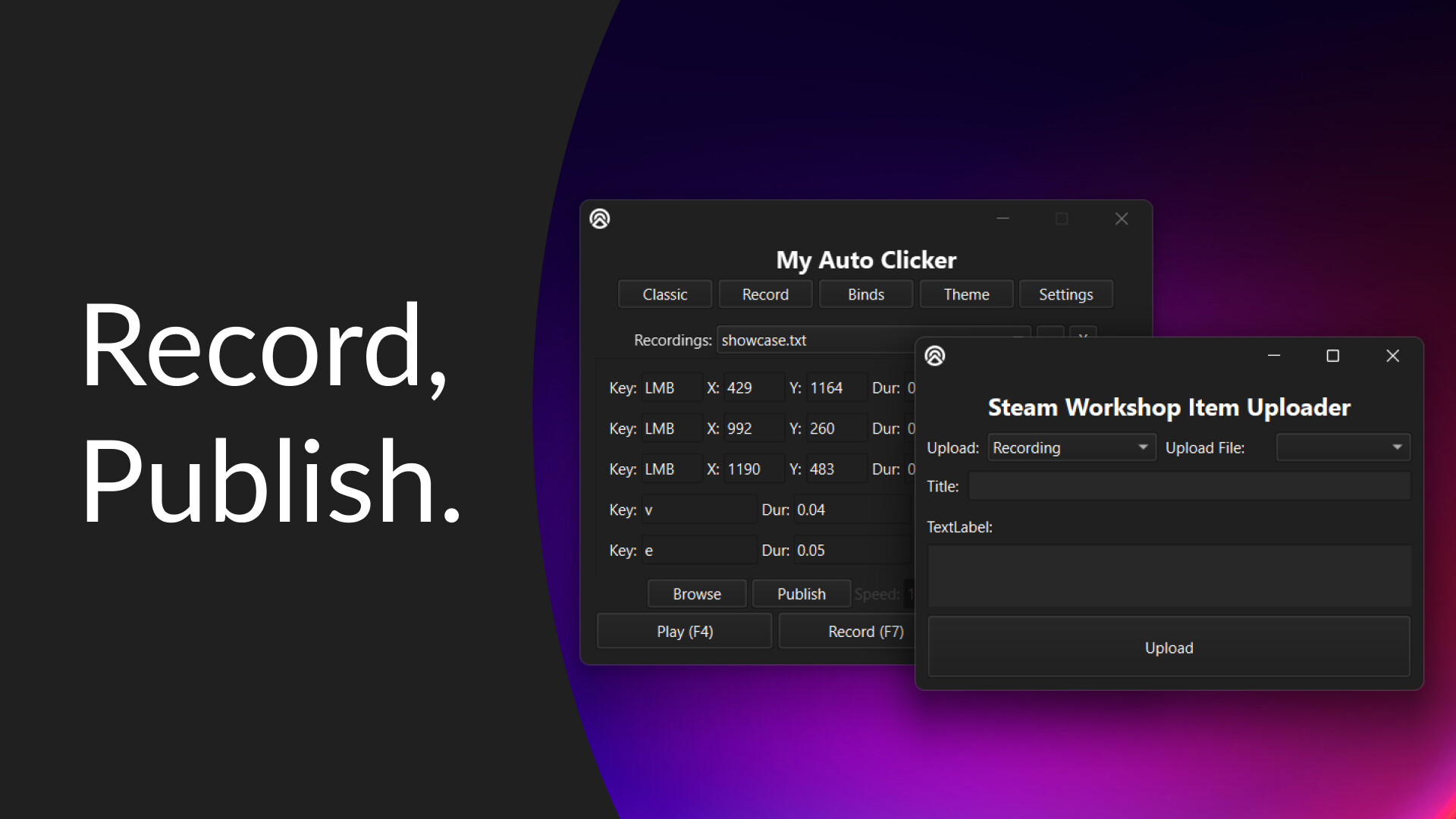 Experience the full game-automation toolkit: a precise auto-clicker, a reliable input recorder, flexible playback binds, and full Steam Workshop support for sharing and downloading everything the community creates.