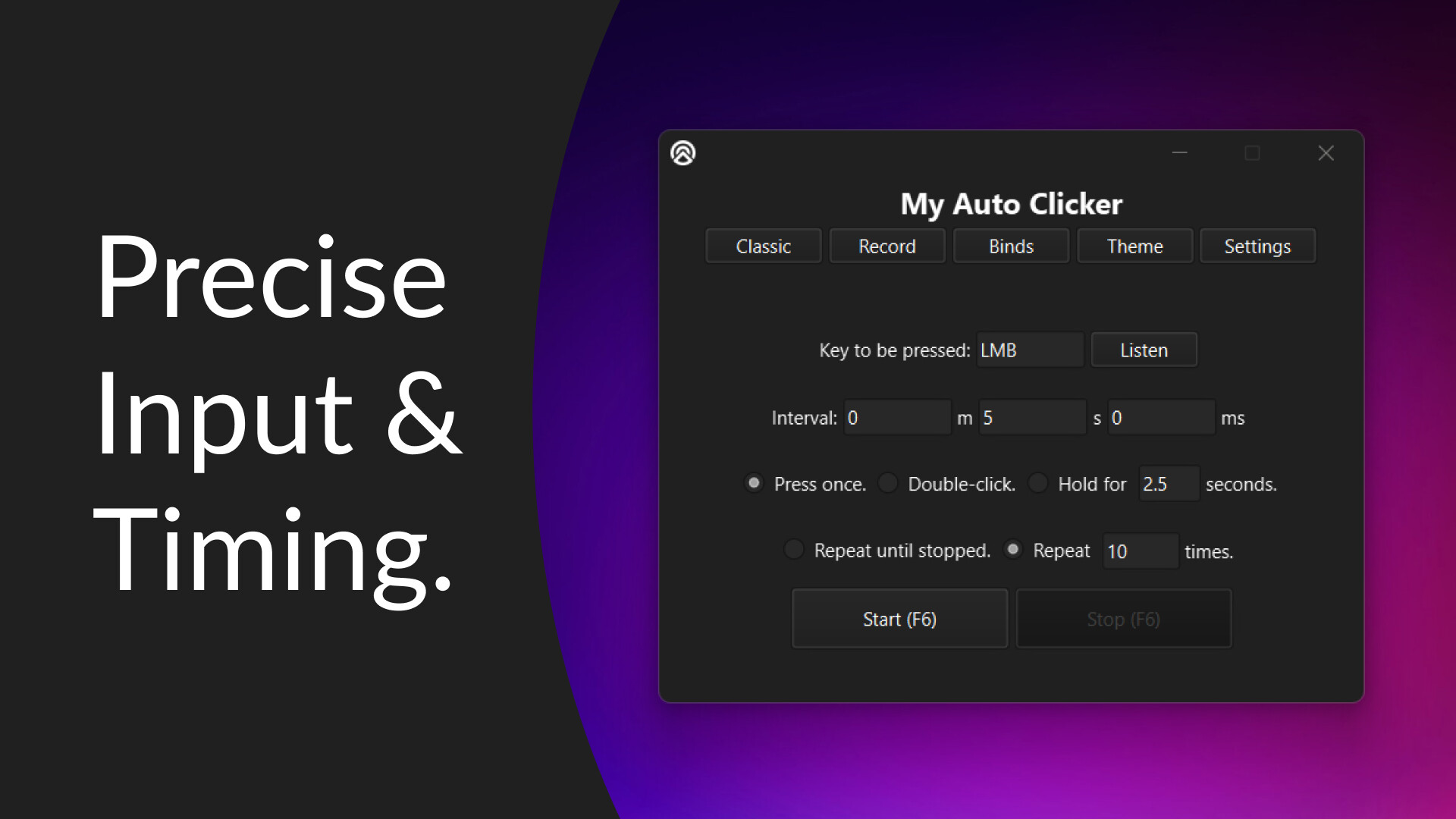A dependable, easy-to-use auto-clicker that gives you complete control. Pick any key, set any interval, and automate with perfect consistency.
