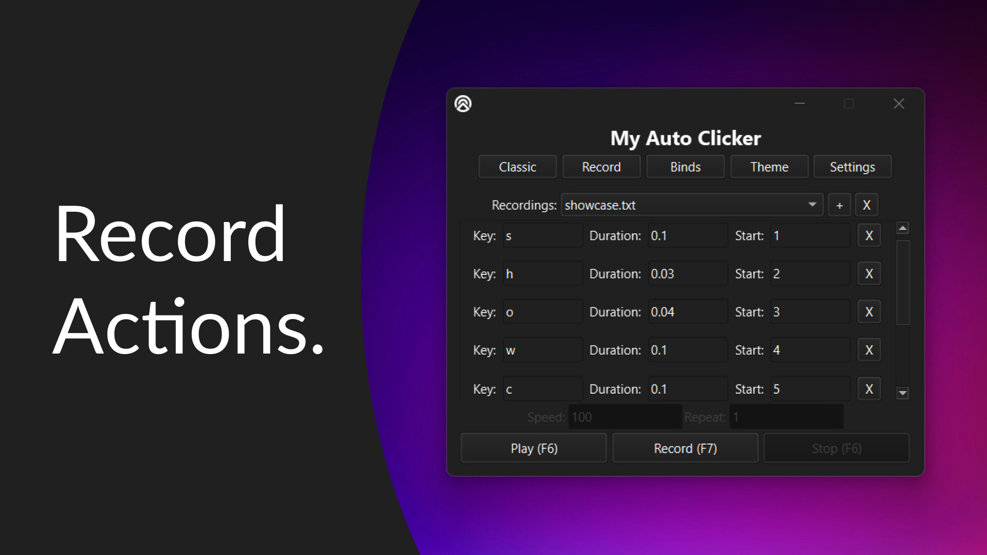 Capture your mouse and keyboard actions with millisecond accuracy. Whether you're grinding, or speeding through routine steps, you can record complex sequences and replay them exactly as they happened.