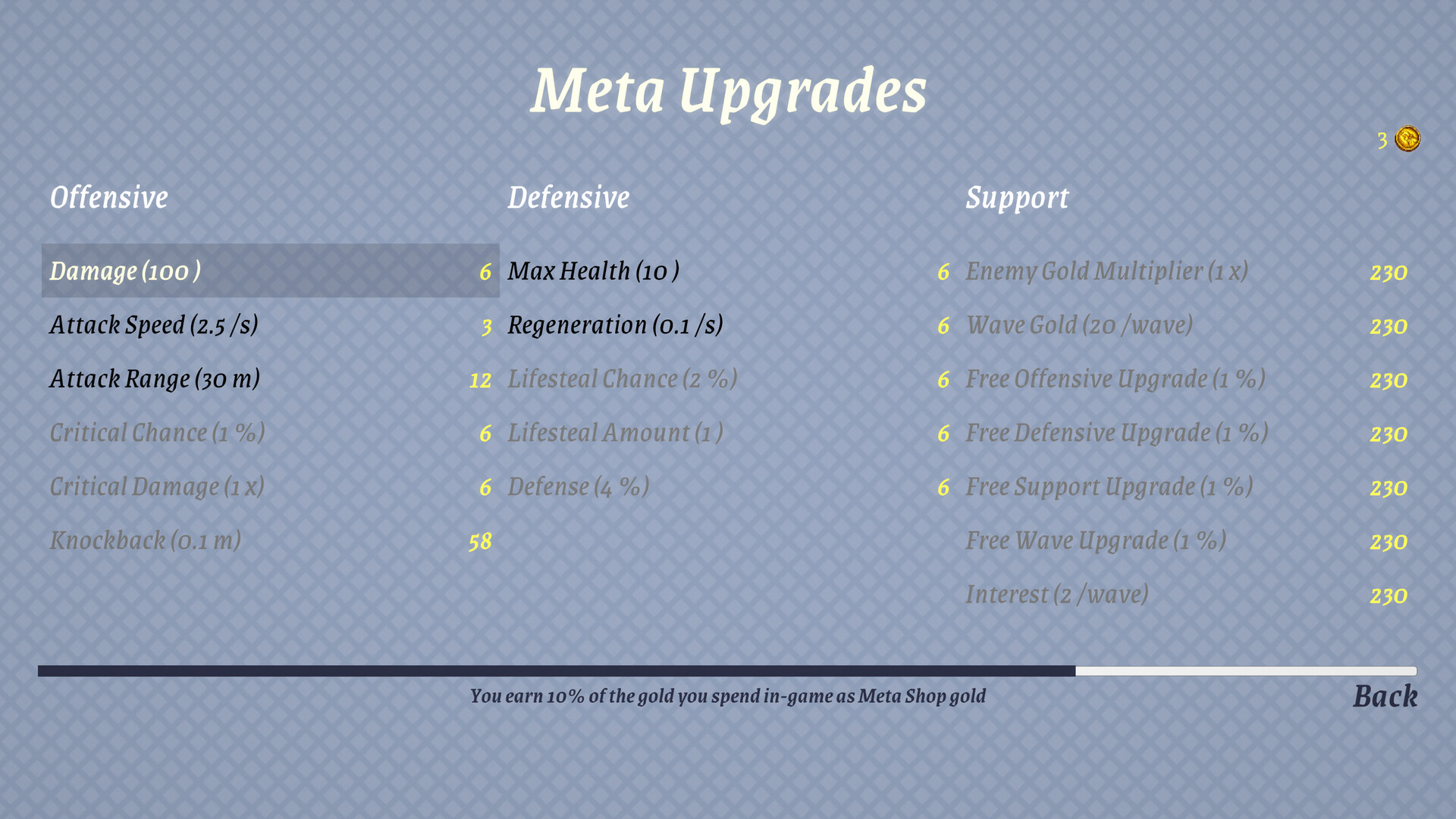 Earn Gold after each trial and spend it in the meta-upgrade menu to permanently raise your tower’s Attack, Defense, or Support stats. Each run builds on the last, so even if you fall before the final wave, you return stronger and more prepared.