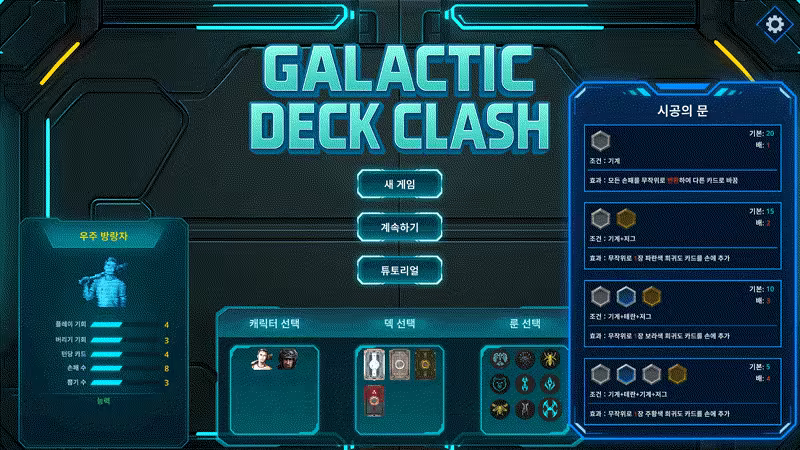 이 게임은 우주를 배경으로 한 덱 빌딩 로그라이크입니다. 수많은 카드를 수집하고, 다양한 종족을 지휘하며, 무궁무진한 조합을 탐색하세요. 카드 효과를 자유롭게 바꾸고 장비, 룬 등으로 자신을 강화하며 강력한 적에게 반복 도전할 수 있습니다.