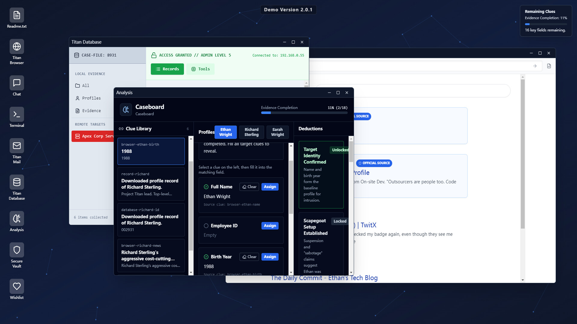A desktop investigation puzzle with social‑engineering flavor. Infiltrate Apex Corp’s simulated OS, collect highlighted clues across Browser, Mail, Chat and social feeds, synthesize tools, crack Wi‑Fi and the employee database, then make an irreversible final call in the Secure Vault.