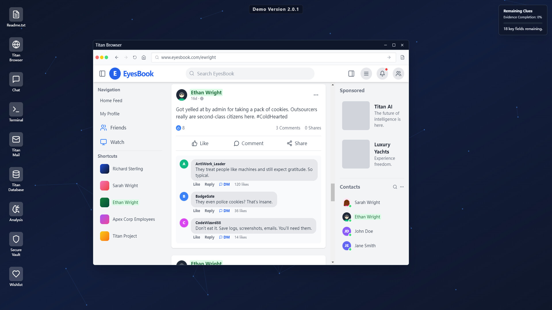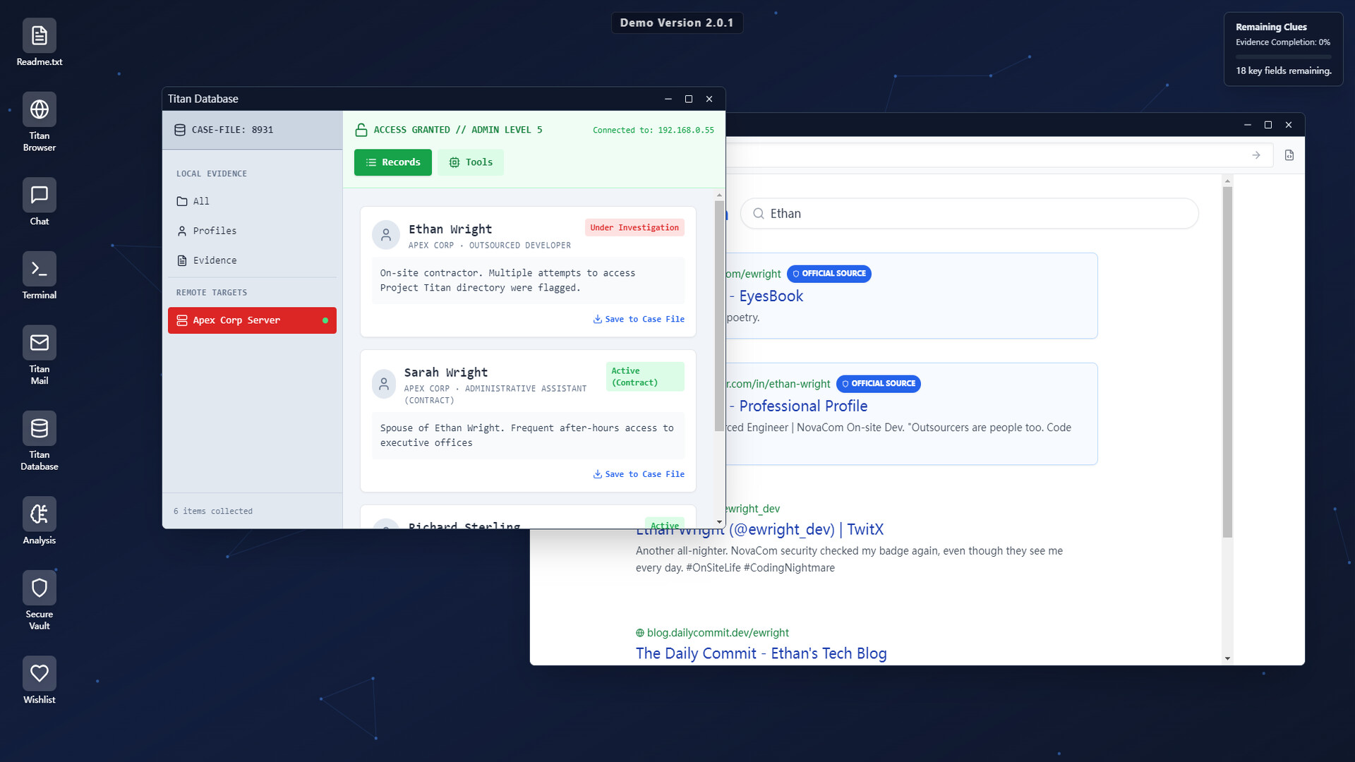 - What’s included: Browser, Titan Mail, Chat, EyesBook, Terminal, Database, Caseboard, Secure Vault; 3 key characters with multi‑source info (news/social/internal mail/messages/records); craftable progression tools (e.g., password dictionary, fake identity).